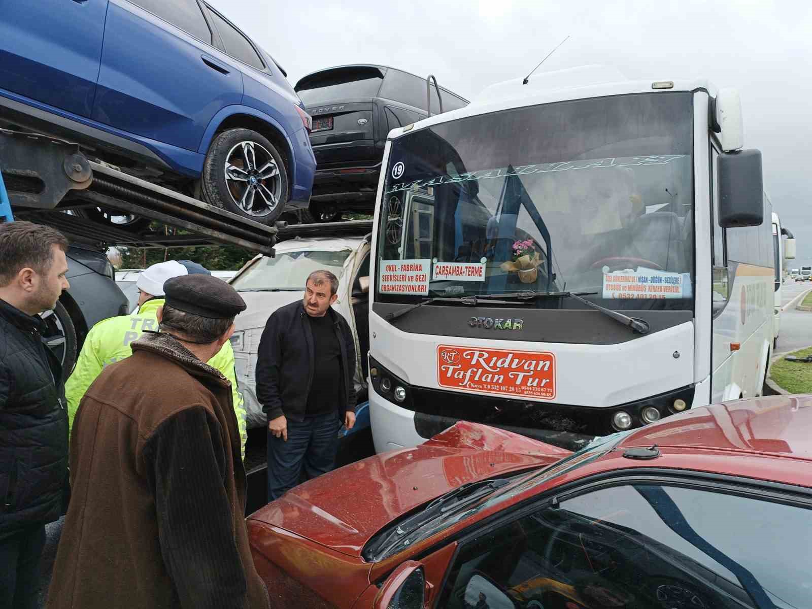 Kaza, saat 11.15’te Ordu-Samsun karayolu Tekkeköy ilçesi Costal Kavşağı’nda meydana geldi. Edinilen bilgiye göre, A.D.’nin kullandığı sıfır araç yüklü DN 818 GE Gürcistan plakalı tır, orta şeritten sol şeride girdi. Kavşağa dönüş yapmak isteyen tır, sol şeritte ilerleyen anaokulu öğrencilerini taşıyan M.A.’nın kullandığı 55 C 6346 plakalı midibüse çarparak sıkıştırdı. Midibüs de H.A. idaresindeki 34 HZG 82 plakalı otomobile vurdu.