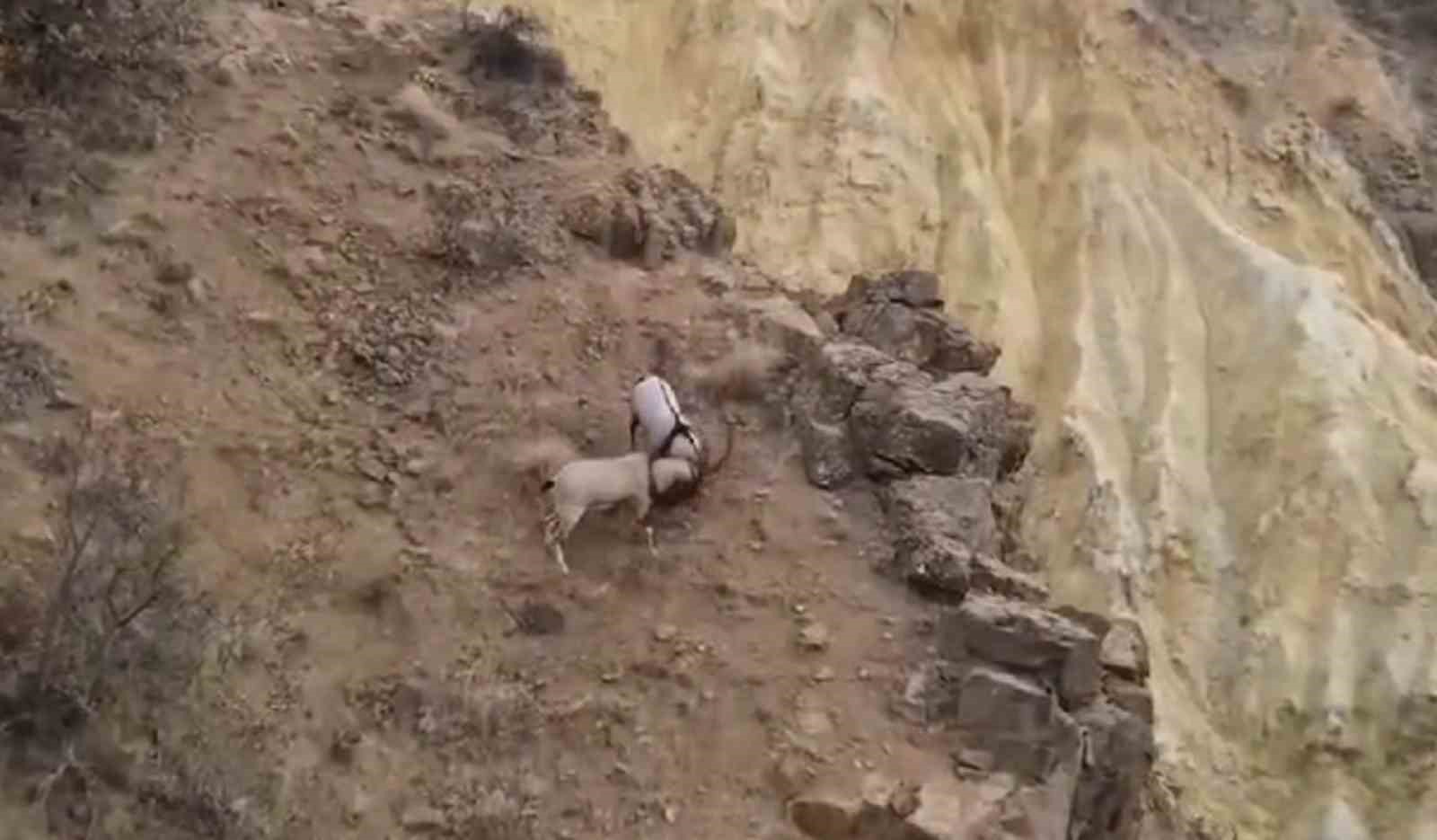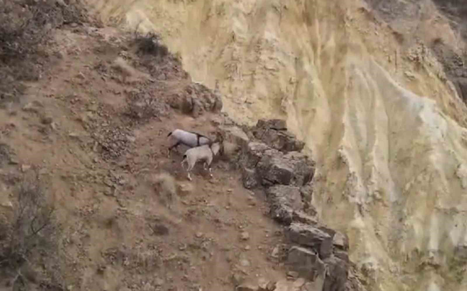 Sivas’ta sarp kayalıklarda dövüşen dağ keçileri, dron ile görüntülendi.