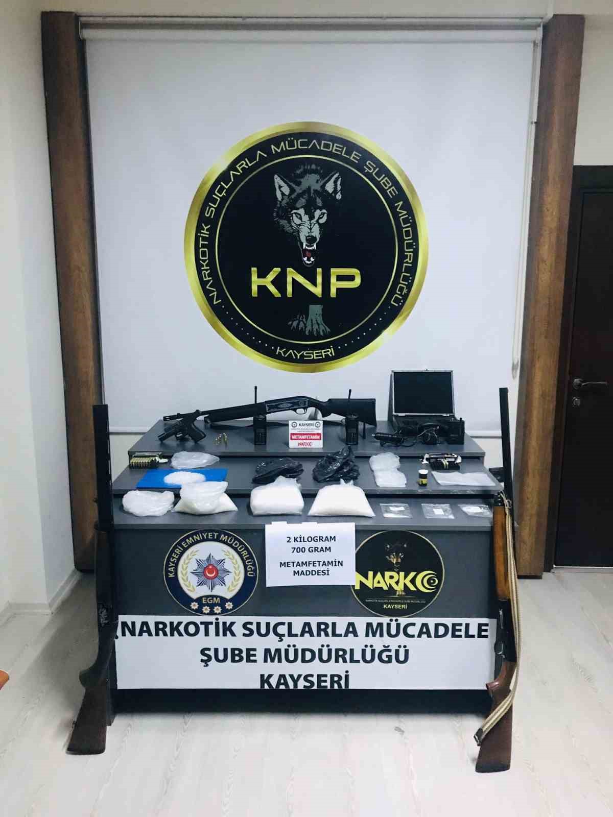 Kayseri’de narkotik ekipleri tarafından düzenlenen operasyonda 3 kişi suçüstü yakalanırken, 2.7 kilo uyuşturucu madde ele geçirildi.