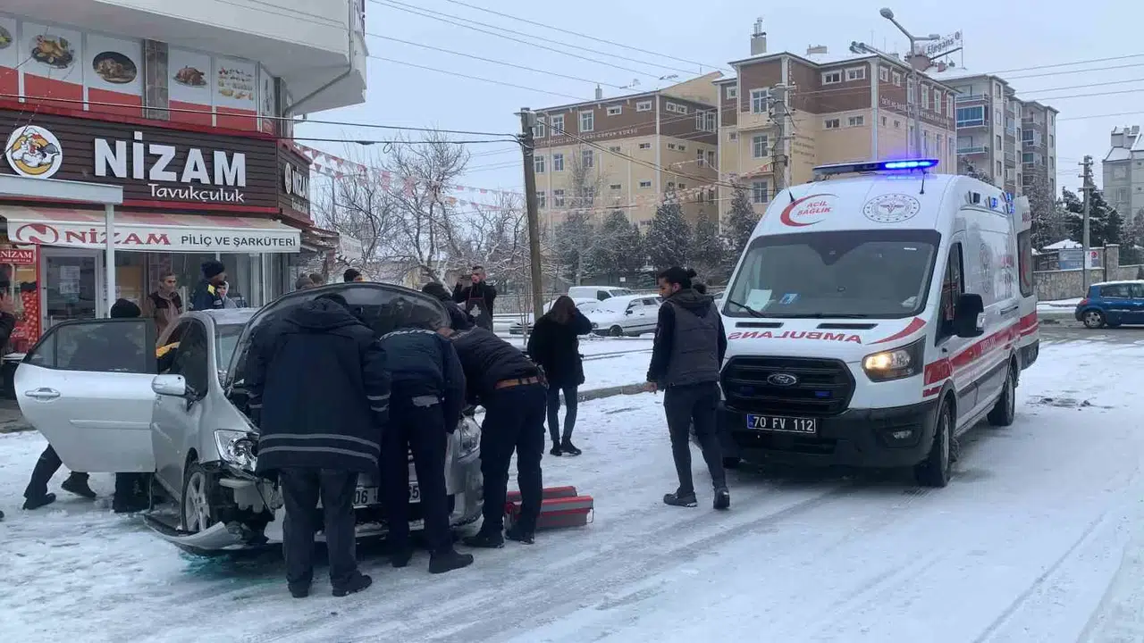 Kaza, sabah saatlerinde Ziya Gökalp Mahallesi Şehit Şahin Mavi Caddesi üzerinde bulunan kavşakta yaşandı. Edinilen bilgiye göre, A.T. yönetimindeki 34 FYT 043 plakalı Fiat marka hafif ticari araç kavşakta D.T. idaresindeki 06 DN 4654 plakalı Toyota marka otomobile çarptı. Kazadan sonra kontrolden çıkan otomobil kaldırıma çıkarak tavuk satışı yapan iş yerinin tavuk pişirme kabinine çarparak durdu. O anlar ise kameraya yansıdı. Kazada otomobilde yolcu olarak bulunan A.Ç. isimli yaşlı kadın yaralandı. İhbar üzerine adrese sağlık, itfaiye ve polis ekipleri sevk edildi. Otomobilin içindeki yaralı yaşlı kadın sağlık ve çevredeki vatandaşların yardımıyla araç içerisinden çıkarılarak ambulansa alındı. İlk müdahalesi ambulansta yapılan yaşlı kadın daha sonra götürüldüğü Karaman Eğitim ve Araştırma Hastanesi’nde tedavi altına alındı.