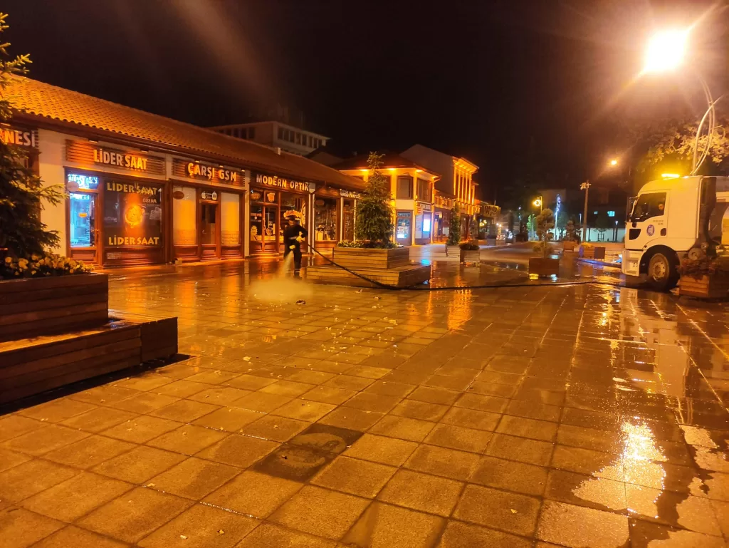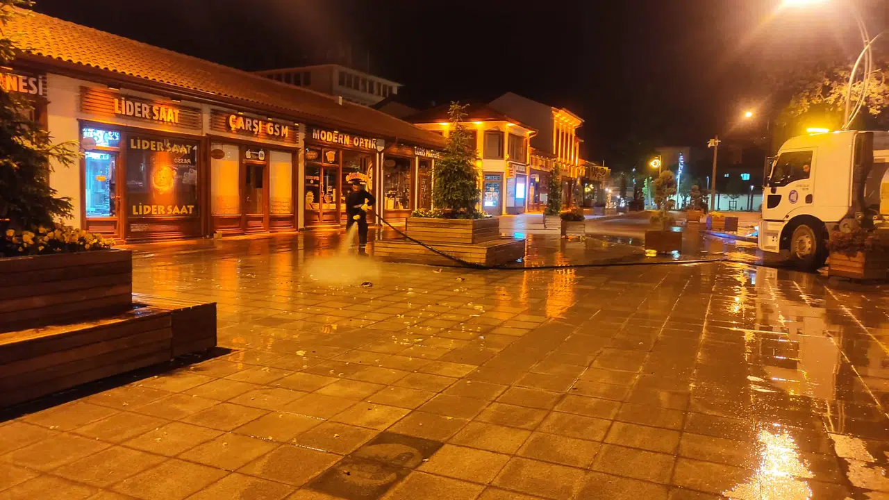 Çorum Belediyesi, Kurban Bayramı öncesinde şehrin genelinde hummalı bir temizlik çalışması başlattı. Cadde ve kaldırımları yıkayarak temizleyen ekipler, trafiği aksatmamak için gece yarısından sonra çalışıyor.