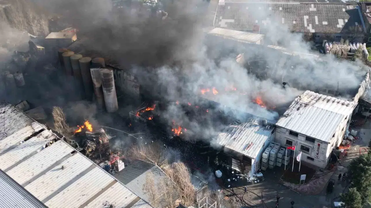 Kocaeli’nin Gebze ilçesindeki kimyasal fabrikasında çıkan yangın kontrol altına alındı. Ekiplerin soğutma çalışmaları dron ile görüntülendi.