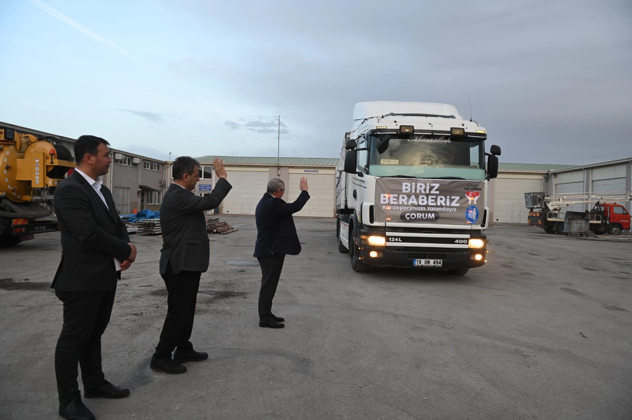 Çorum Belediyesi, 50 çadır, iç çamaşırı ve leblebi içeren üç tır yardım malzemesini Kahramanmaraş’ın Afşin ilçesine gönderdi.