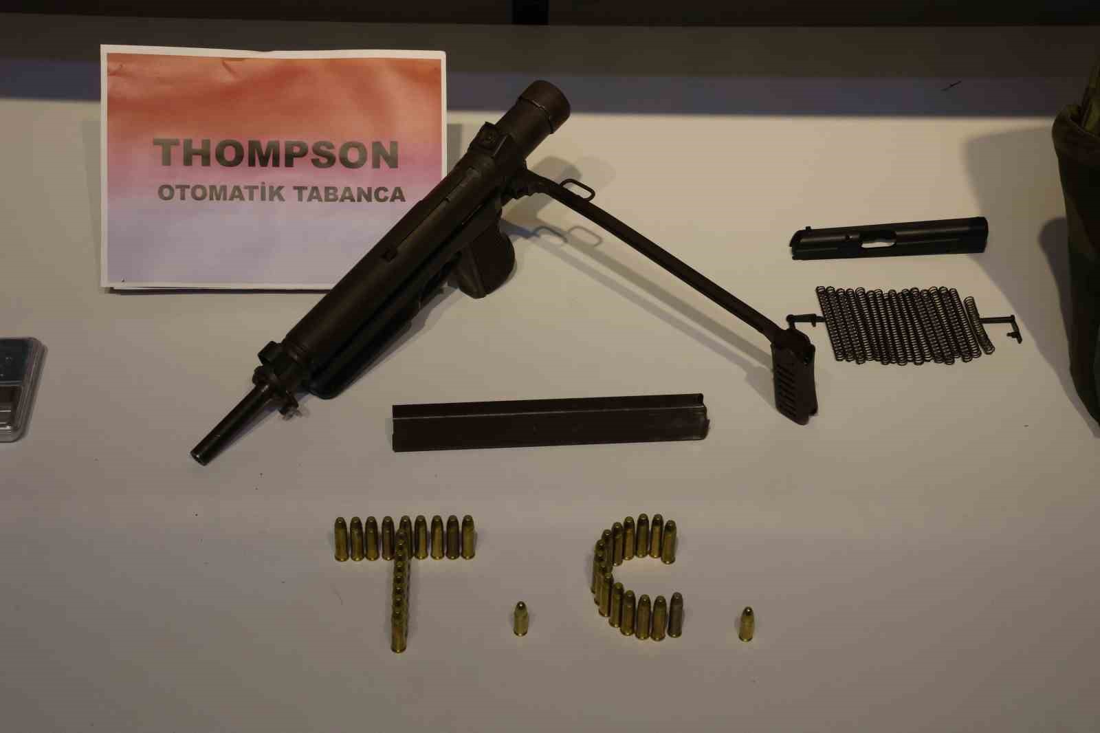 Evde içerisinde yapılan arama çalışmalarında bazanın altındaki eşyaların arasına gizlenmiş anahtar şeklinde anahtarlık şeklinde suikast tabancası, 1’i otomatik 3 ruhsatsız tabanca, 79 mermi, çelik yelek, 3,7 gram taş kokain, silah yapımında kullanılan 9 sürgü tutucu, 10 icra mili, 17 icra yayı ile 8 kurusıkı namlusu ele geçirildi.