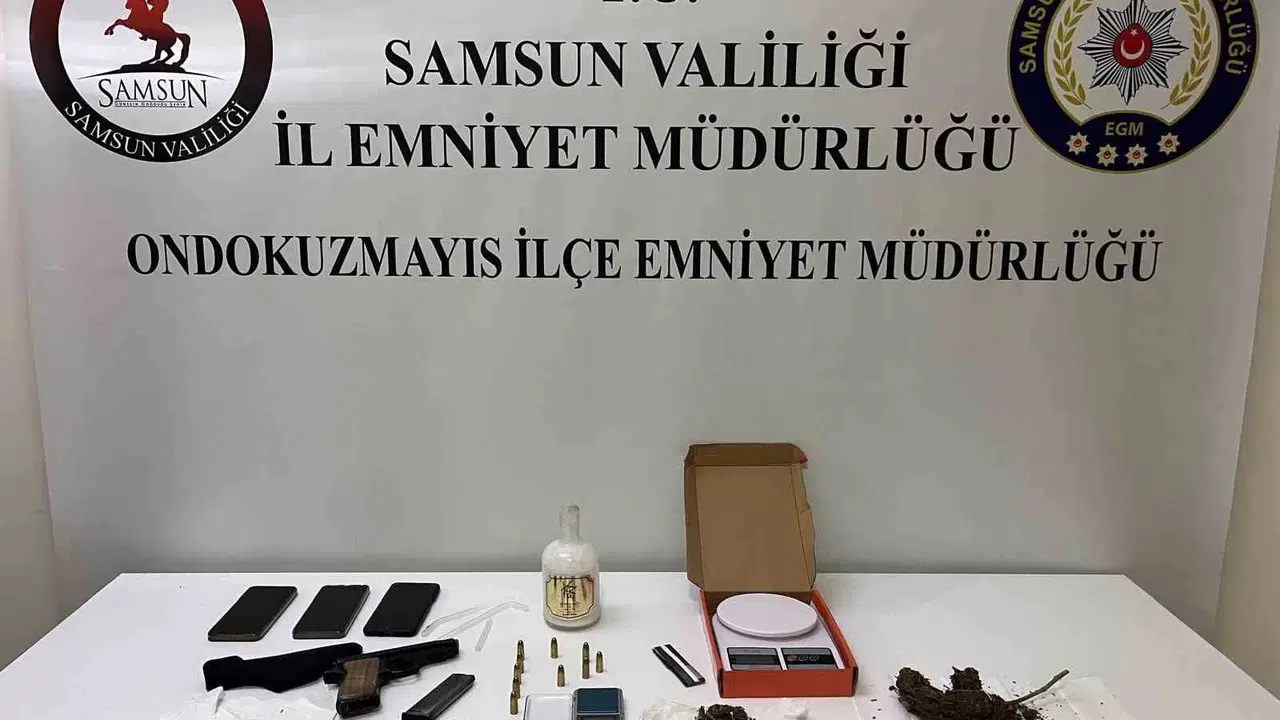 Edinilen bilgiye göre, Samsun’un 19 Mayıs ilçesinde polis uyuşturucu ticareti yaptıkları tespit edilen M.D. ve K.A.’nın evlerine operasyon düzenlendi. Yapılan aramalarda, 2 adet hassas terazi, 60 gram esrar, 1 adet ruhsatsız tabanca ve 10 adet fişek ile uyuşturucu madde sarmada kullanılan çeşitli malzemeler ele geçirdi. Olayla ilgili M.D. ve K.A. gözaltına alındı. Soruşturma devam ediyor.