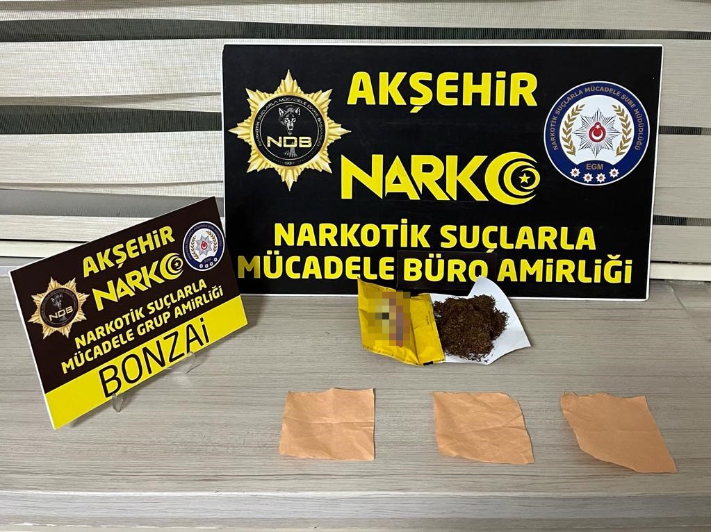 Edinilen bilgiye göre, Akşehir İlçe Emniyet Müdürlüğü Narkotik Suçlarla Mücadele Büro Amirliği ekipleri, gençleri zehirlemek için sokak satıcılığı yapan şahıslar ve uyuşturucu madde kullanıcılarına yönelik çalışmalarını sürdürüyor. Bu çerçevede yapılan istihbarı çalışmalar kapsamında Konya plakalı araç ile ilçeye uyuşturucu getirildiği belirlendi. Takibe alınan araç 24 Ağustos Bulvarı üzerinde durduruldu. Araçta ve içerisinde bulunan 2 kişi üzerinde yapılan aramada, 2 adet 10x10 ölçülerinde 1 adet 11x10 ebadında yaklaşık bin 200 içimlik kağıda emdirilmiş ve 152 gram tütüne karıştırılmış bonzai ele geçirildi. Gözaltına alınan H.A. isimli şüpheli hakkında “ Uyuşturucu Madde Bulundurmak, Kullanmak ve Kabul Etmek” suçundan işlem yapılarak serbest bırakıldı. Diğer şüpheli H.A. hakkında ise “ Uyuşturucu Madde Bulundurmak, Kullanmak, Kabul Etmek suçu ile Uyuşturucu Madde Ticareti” suçlarından işlem yapılarak adliyeye sevk edildi. Savcılık sorgulamasının ardından tutuklanma talebiyle Sulh Ceza Mahkemesine sevk edilen H.A., tutuklanarak Akşehir Cezaevine gönderildi.