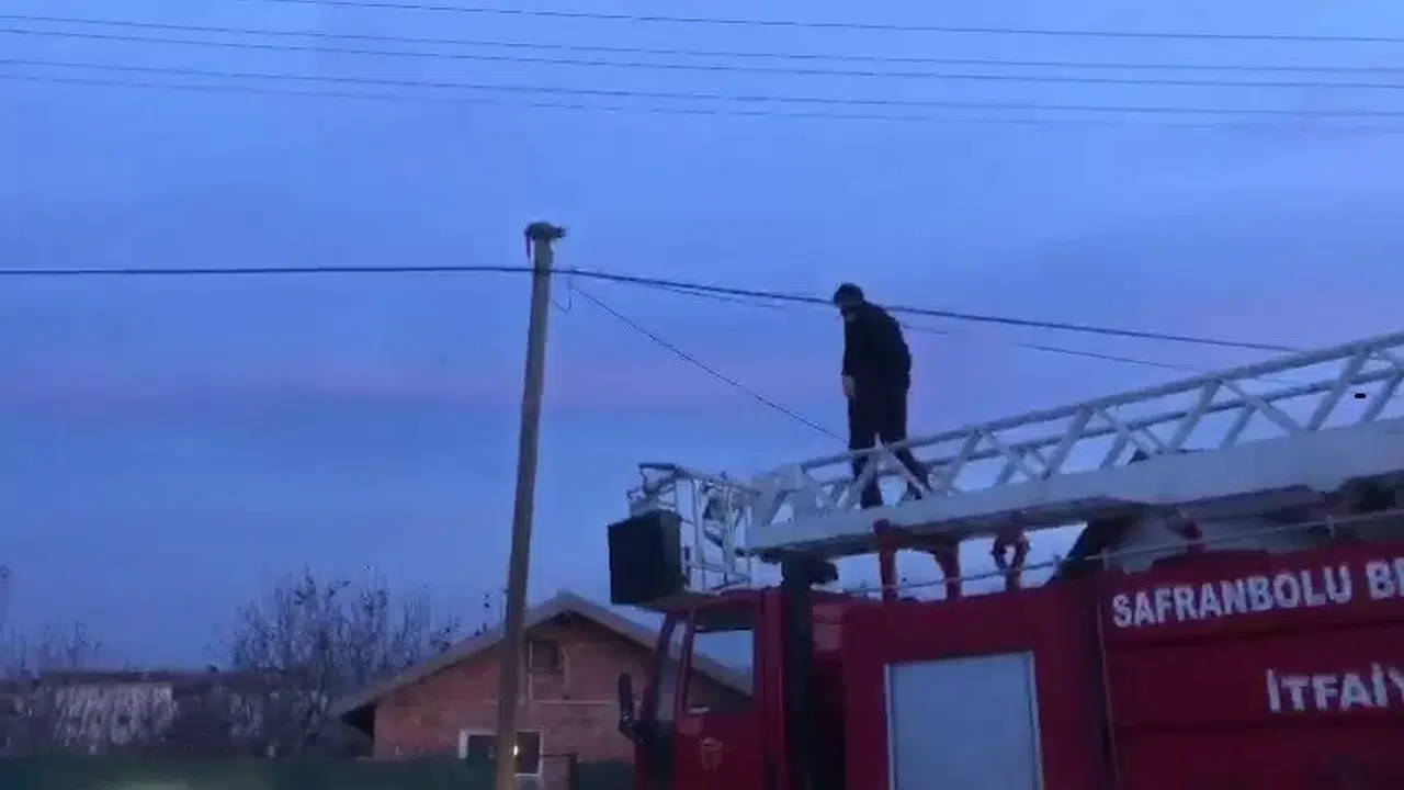 Karabük’ün Safranbolu ilçesinde sokak köpeklerinden kaçtığı sırada çıktığı elektrik direğinde mahsur kalan kediyi itfaiye ekipleri kurtardı.