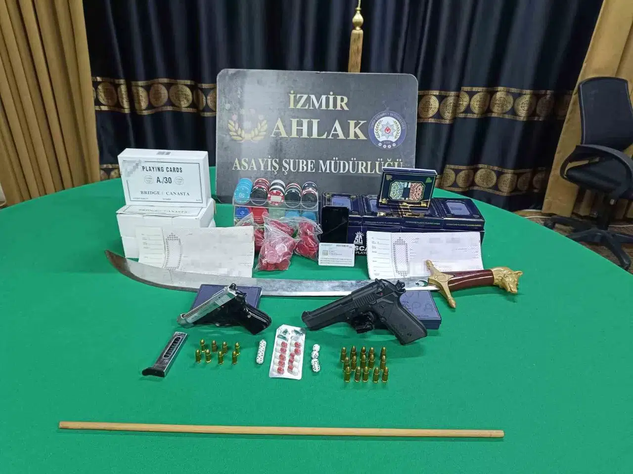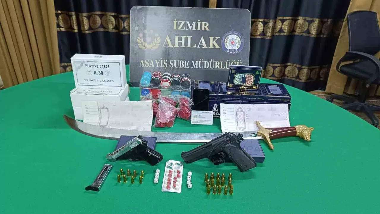 İzmir Asayiş Şube Müdürlüğü Ahlak Büro Amirliği ekipleri, Karabağlar ilçesi Selvili Mahallesi’nde bulunan ruhsatsız iş yerinde kumar oynandığı ihbarı üzerine harekete geçti. Ekipler tarafından adrese yapılan operasyon kapsamında adreste arama yapıldı. Gerçekleştirilen aramada, 2 adet ruhsatsız tabanca ve tabancalara ait toplam 24 adet farklı ölçülerde fişek, 80 santim uzunluğuna sahip kılıç, 10 adet yeşil reçeteye tabi sentetik hap, 2 farklı şahıs adına düzenlenmiş 920 bin TL bedelli borç senedi, 580 adet para yerine geçen çip, 40 kutu iskambil oyun kağıdı, 8 adet özel yapım barbut zarı ele geçirildi.