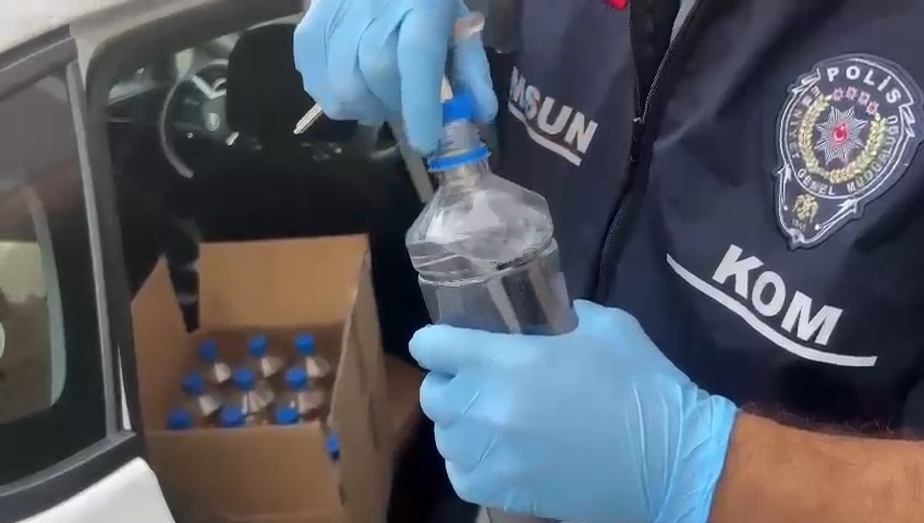 Samsun’da polis tarafından durdurulan şüpheli araçta sahte içki yapımında kullanılan 320 litre etil alkol ele geçirildi.