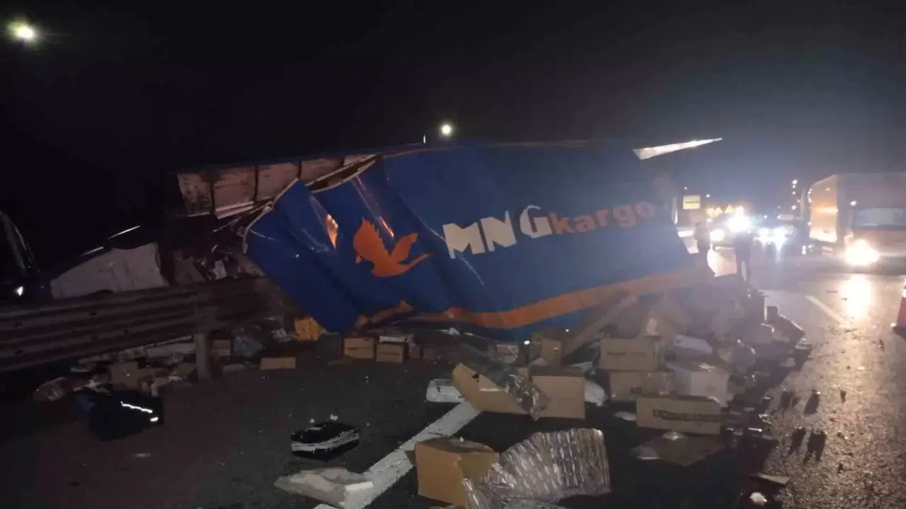 Olay, Kuzey Marmara Otoyolu Edirne istikameti Riva kavşağında meydana geldi. Alınan bilgiye göre Nabi A. idaresindeki 54 RG 072 plakalı tır, Uğur H. yönetimindeki 06 ED 9924 plakalı kargo firmasına ait kamyona arkadan çarptı. Çarpmanın etkisiyle kargo firmasına ait kamyon devrilerek yol kenarına savrulurken tır da sol şeritteki bariyere girdi. Kaza nedeniyle kargo firmasına ait kamyondaki yükler otoyola saçılırken iki şoför de yaralandı. Durumun bildirilmesi üzerine bölgeye itfaiye, sağlık, jandarma ve polis ekipleri sevk edildi. Tırda sıkışan Nabi A, itfaiye ekiplerinin çalışmaları sonucu sonucu sıkıştığı yerden çıkarılarak ambulansla hastaneye kaldırıldı. Yaralı 2 şoförün sağlık durumlarının iyi olduğu öğrenildi.