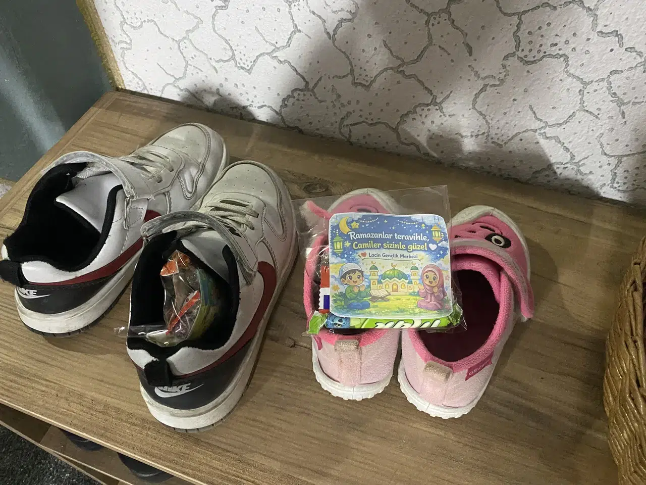 Çorum'un Laçin ilçesinde camiye giden çocuklar, teravih namazı çıkışında ayakkabılarının içine bırakılan sürpriz hediyeleri görünce mutluluk yaşadı.