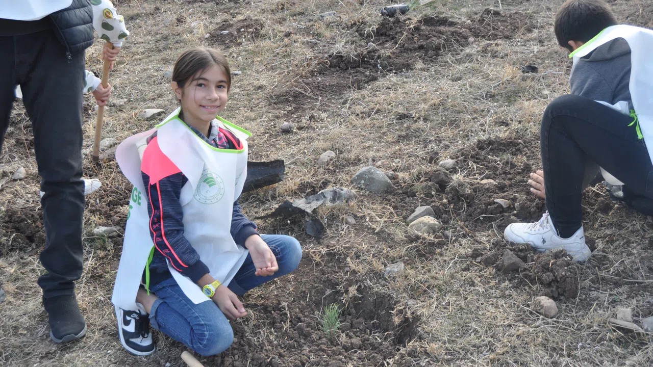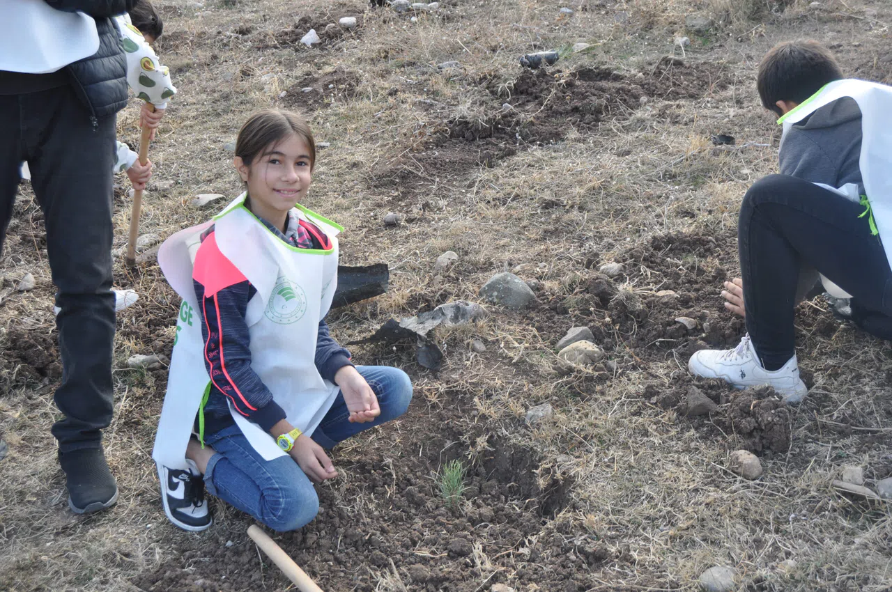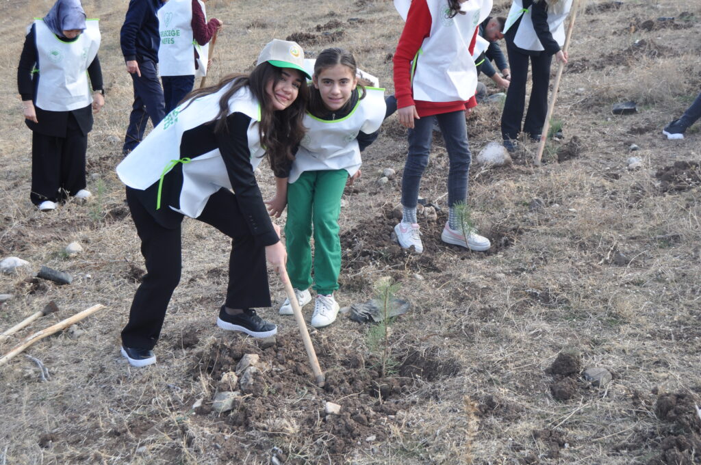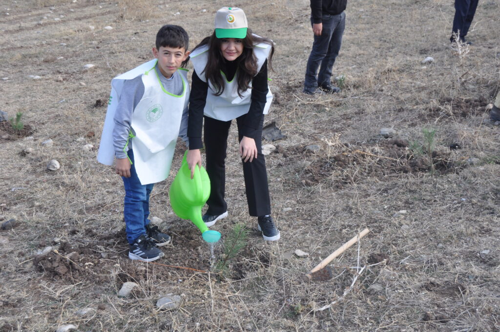 Laçin Kaymakamı Yağmur Şimşek ve Belediye Başkanı İdris Görükmez, Mescitli köyündeki ağaçlandırma alanında öğrencilerle 150 fidan dikti.