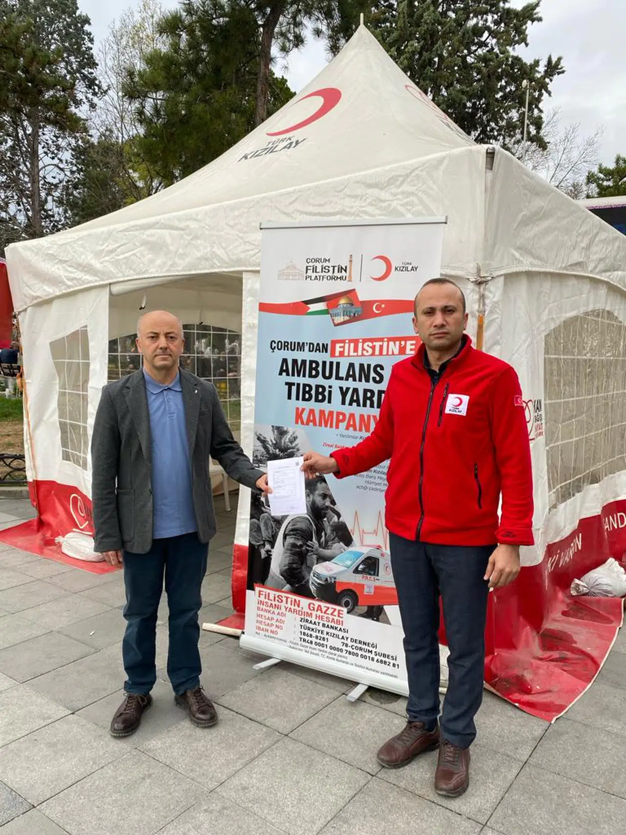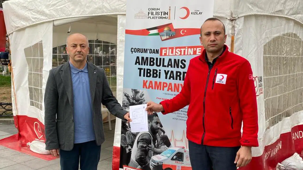 Vahit Sucu, “Çorum Filistin Platformu ve Çorum Kızılay tarafından düzenlenen ortak kampanyaya destek olmak, Filistinli kardeşlerimizin yaralarına merhem olmak istedik , bu nedenle tıbbi malzeme ve ambulansiçin düzenlenen kermeste topladığımız 25 bin TL parayı Kızılay’a teslim ettik” dedi.