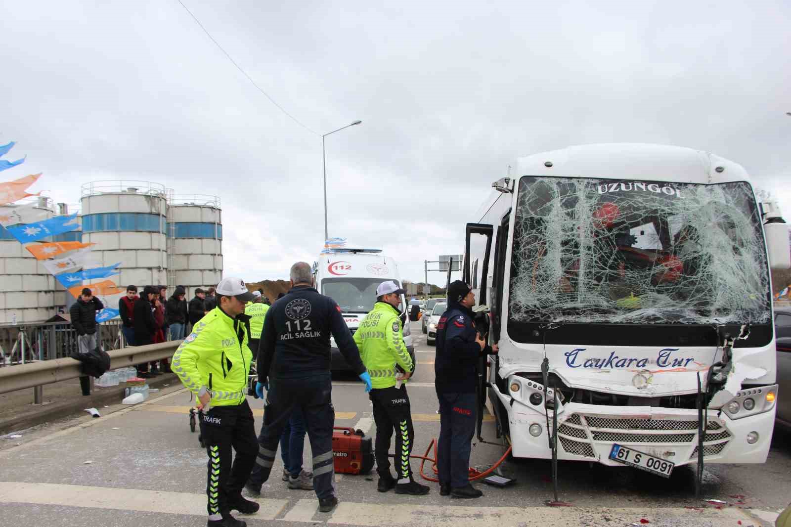 Kaza, Karadeniz Sahil Yolu Rize-Trabzon istikametinde meydana geldi. Edinilen bilgiye göre, Çaykara ilçesinden yola çıkan Kerim Tosun yönetimindeki 61 S 0091 plakalı midibüs, Ortahisar ilçesinin Değirmendere Mahallesi’nde ani fren yapan tıra çarptı. Çarpmanın etkisiyle sürücü araç içerisinde sıkışırken, kazayı gören çevredeki vatandaşlar durumu 112 Acil Çağrı Merkezi’ne bildirdi. Kaza yerine çok sayıda sağlık, polis ve itfaiye ekipleri sevk edilirken, olay yerine gelen itfaiye ekiplerince araçta sıkışan sürücü kurtarıldı. Çaykaraspor’un maçı için Akyazı’ya giden midibüs içerisinde bulunan ve çarpmanın etkisiyle yaralanan taraftarlar sağlık ekiplerinin ilk müdahalesinin ardından çeşitli hastanelere kaldırıldı. Sürücü ve taraftarların durumlarının iyi olduğu öğrenilirken, kazayla ilgili soruşturma sürüyor.