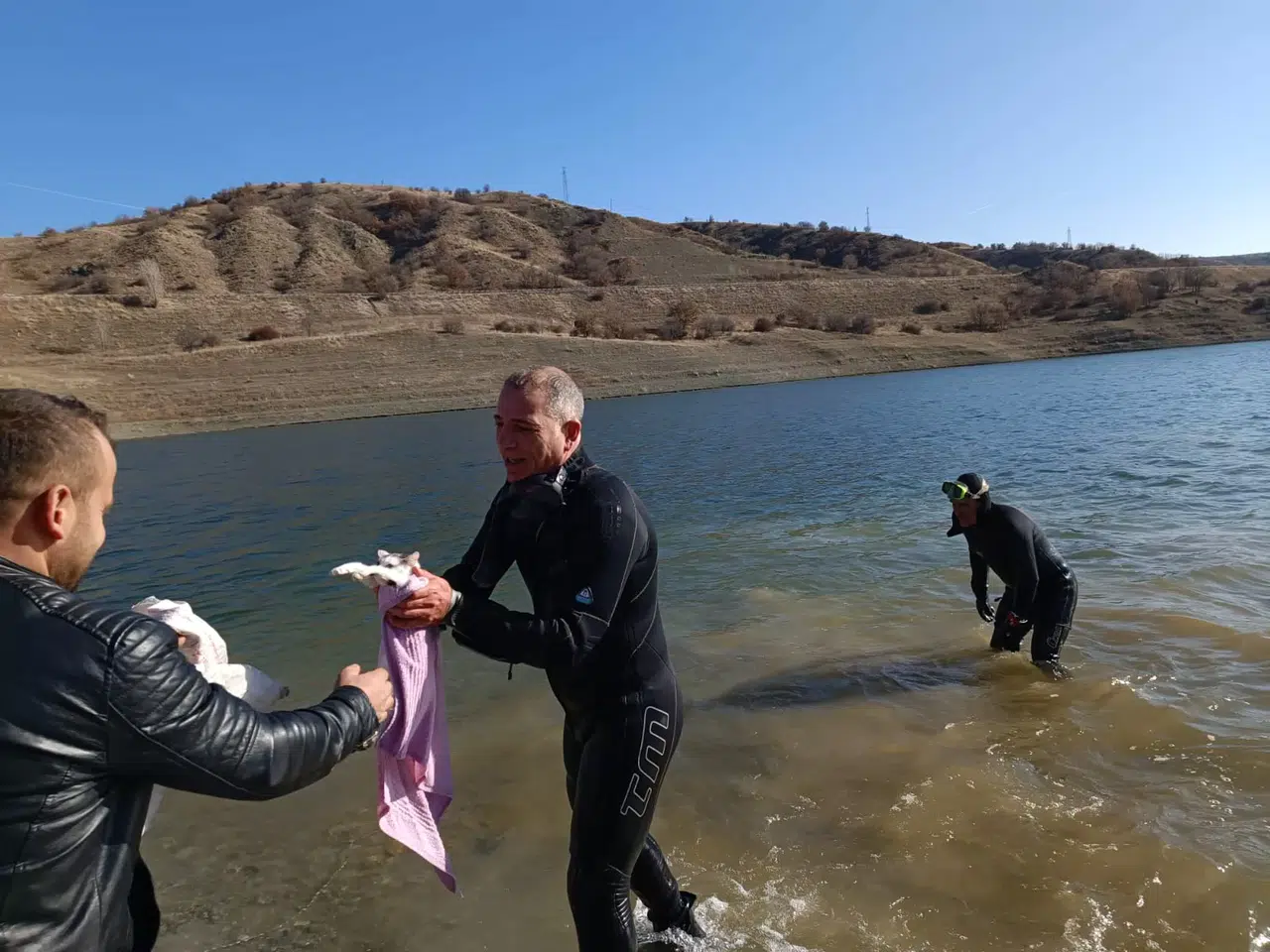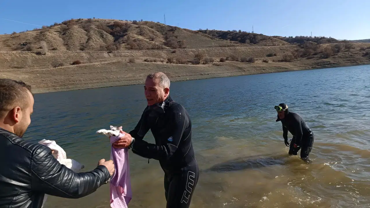 Traktörün üzerine çıkarak yardım isteyen Gazi E.’yi görenler 112’ye ihbarda bulundu. Kısa sürede olay yerine ulaşan Çorum Belediyesi İtfaiye Müdürlüğü’ne bağlı dalgıç ekibi, Gazi E. ve yanındaki kediyi barajdan çıkardı. Gazi E.’nin sağlık durumunun iyi olduğu öğrenilirken, dalgıç kurtarma ekibi sudan çıkardığı yavru kediye Hatap ismini verdi.