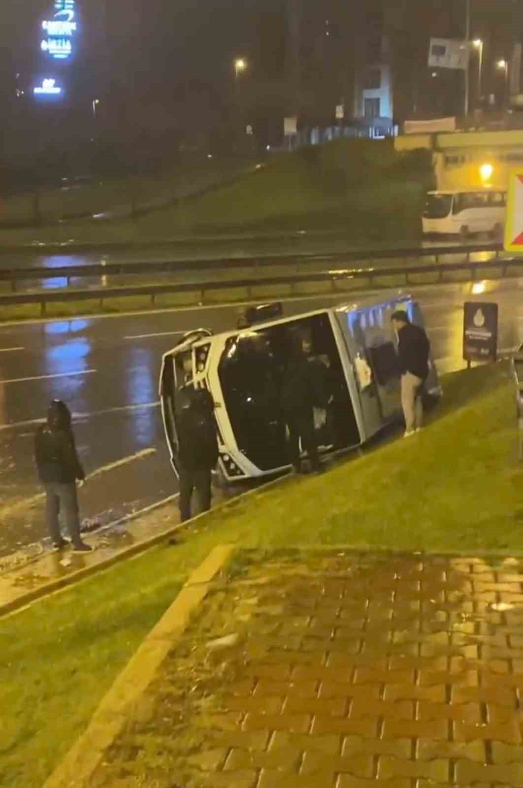 Olay, gece saatlerine Maltepe’de D-100 karayolu üzerinde meydana geldi. İddiaya göre, şiddetli yağışın etkisiyle birlikte kaygan zeminde şoförünün direksiyonu hakimiyetini kaybettiği minibüs yan yattı. Kaza esnasında minibüsün içerisinde yolcu bulunmadığı öğrenildi. Kazayı gören çevredeki vatandaşlar minibüs şoförünün yardımına koştu. Kazada can kaybı ya da yaralanma yaşanmazken araçta maddi hasar oluştu. Yaşananlar vatandaşın cep telefonu kamerasına yansıdı.