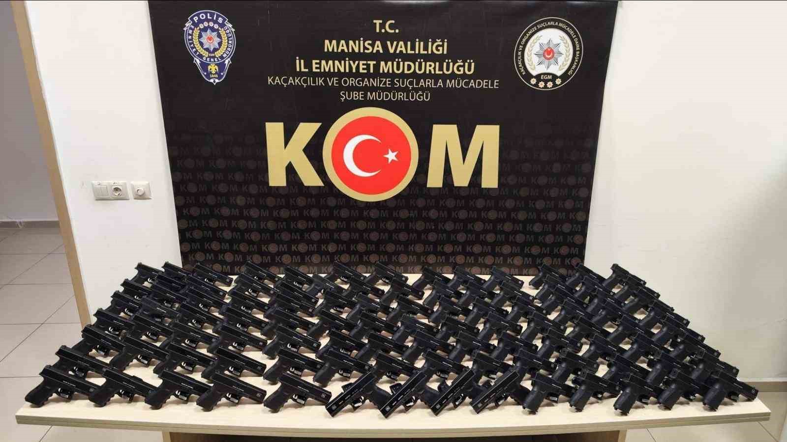 Manisa İl Emniyet Müdürlüğü Kaçakçılık ve Organize Suçlarla Mücadele Şube Müdürlüğü ve İstihbarat Şube Müdürlüğü tarafından silah ticareti suçunun önlenmesine yönelik yürütülen çalışmalarda; kente yüklü miktarda silah sevkiyatı yapılacağı bilgisi alındı. Turgutlu Cumhuriyet Başsavcılığı koordinesiyle harekete geçen polis ekipleri gerçekleştirdiği operasyonda, 100 adet ruhsatsız tabanca ile 100 adet şarjör ele geçirdi. Operasyonda kapsamında gözaltına alınan A.P. (23) ve S.C.S. (17) isimli şahıslar tutuklanarak cezaevine gönderildi.