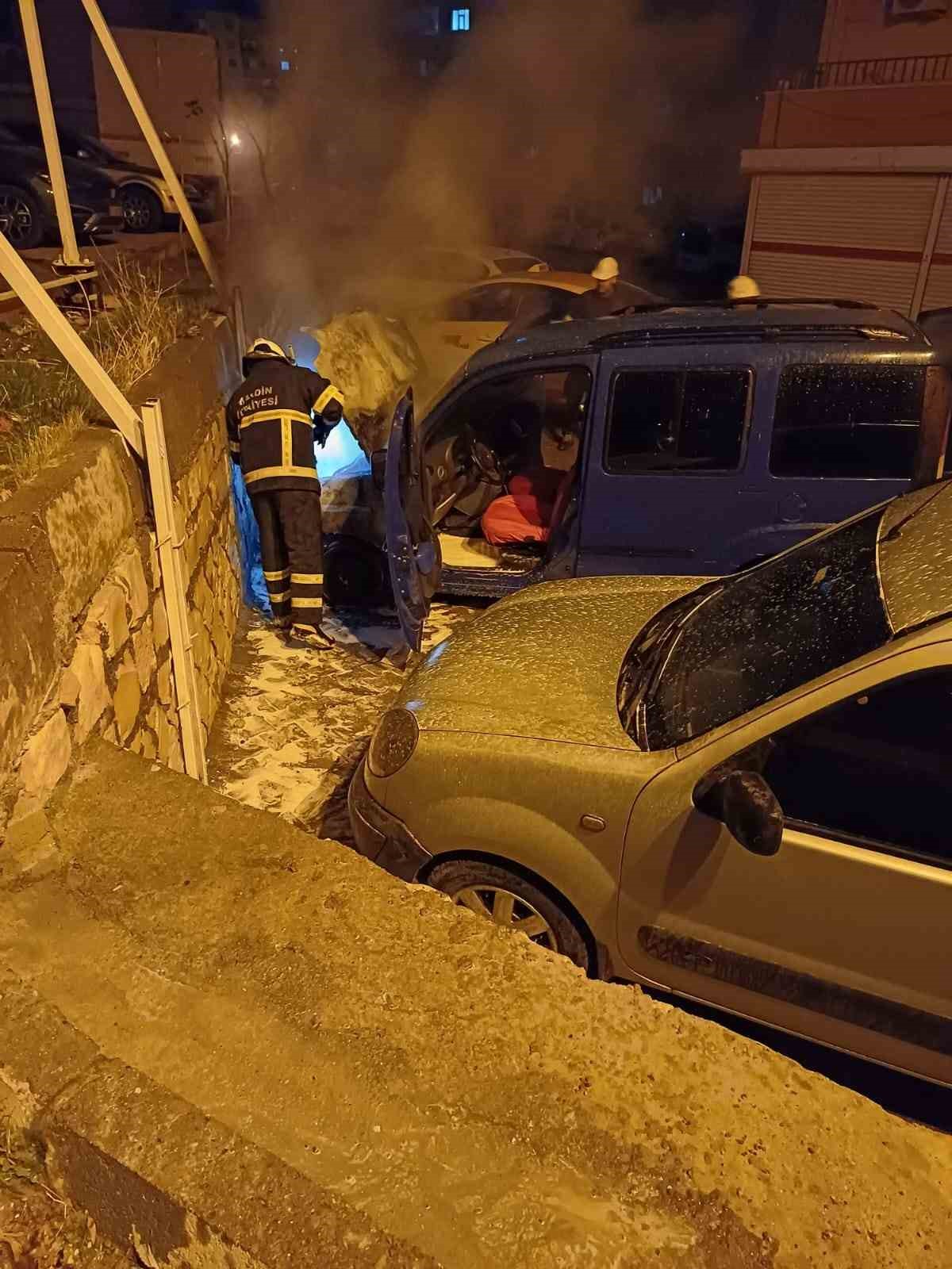 Mardin’in Artuklu ilçesinde park halindeki hafif ticari araç, gece yarısı alev alarak kullanılamaz hale geldi.