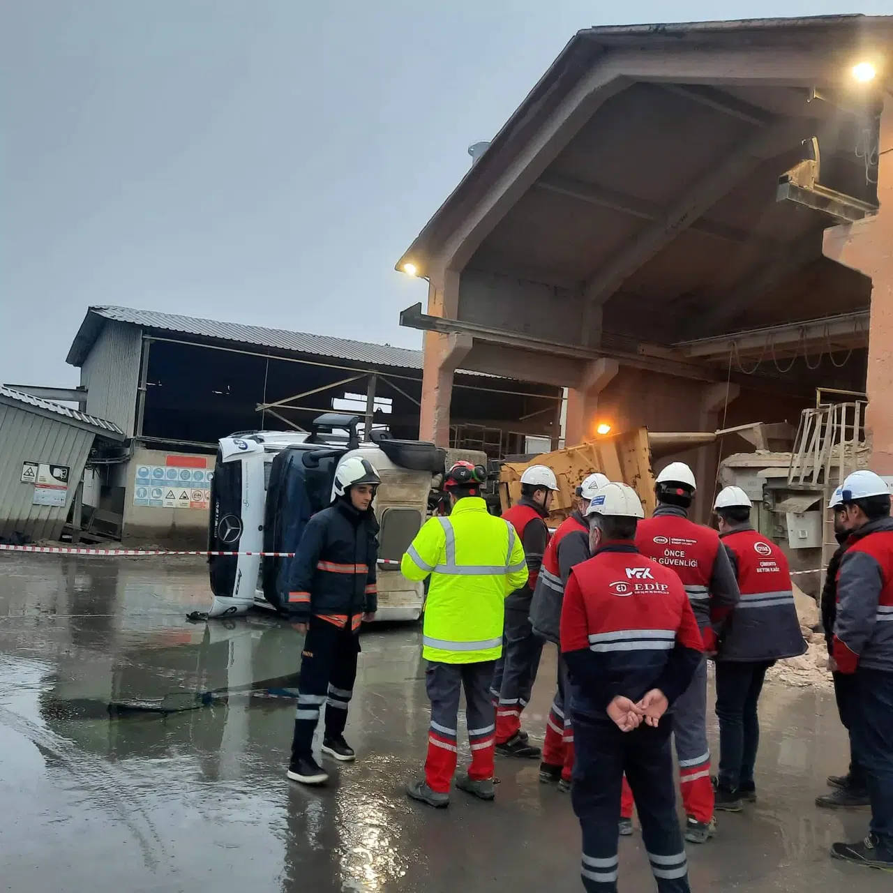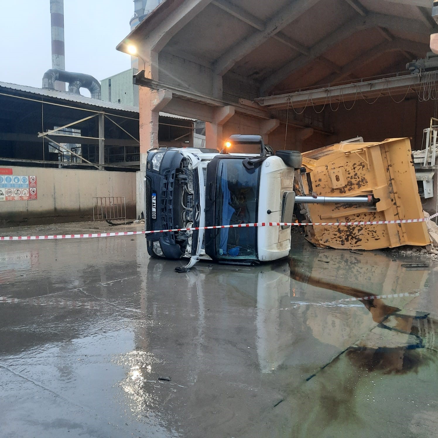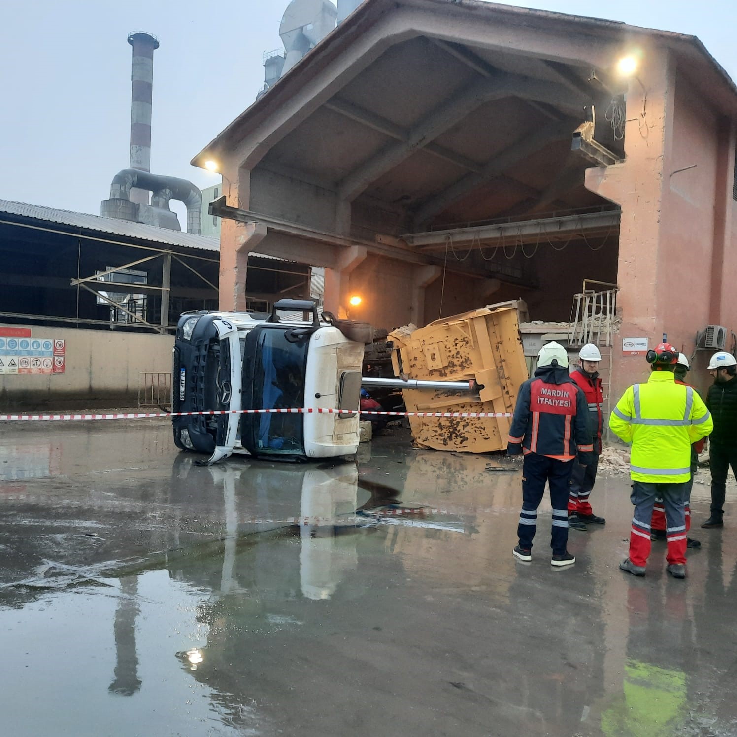 Alınan bilgilere göre, ilçenin Kabala Mahallesi’nde bulunan bir çimento fabrikasında 47 AAF 008 plakalı hafriyat kamyonu sürücüsünün direksiyon hâkimiyetini kaybetmesi sonucu devrildi. 112 Acil Çağrı Merkezine yapılan ihbar üzerine olay yerine polis ve sağlık ekibi sevk edildi.
