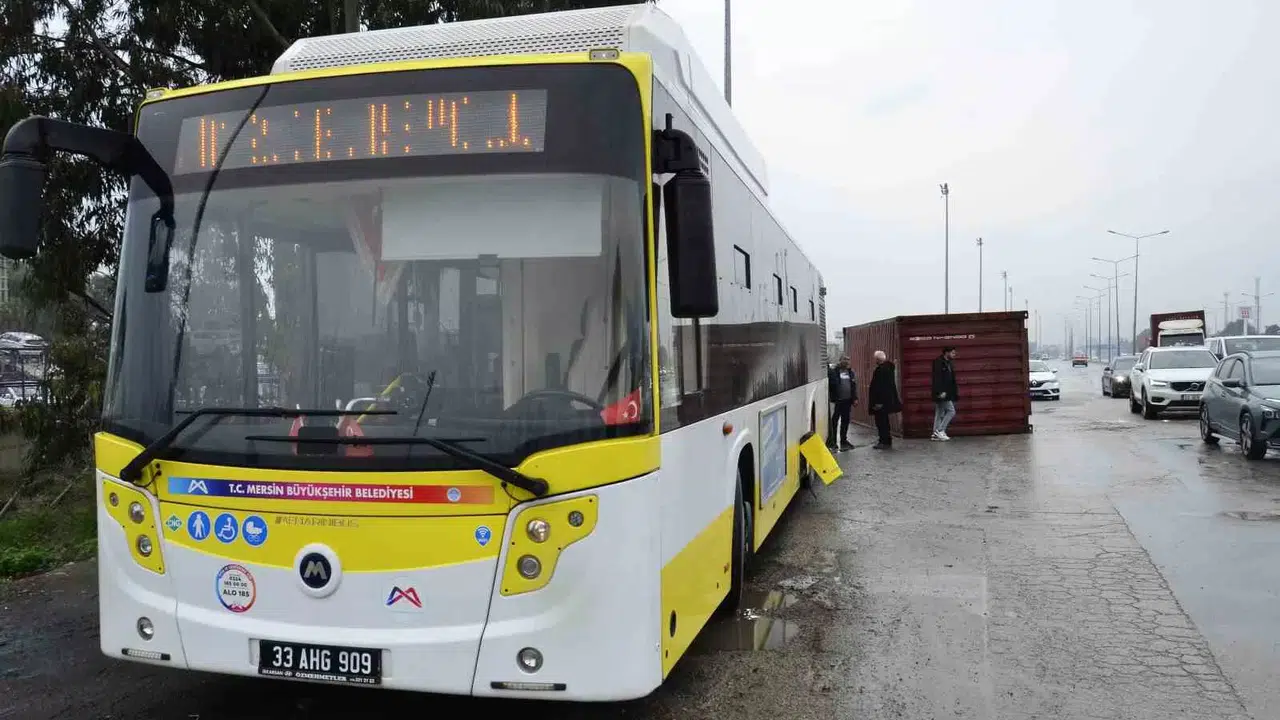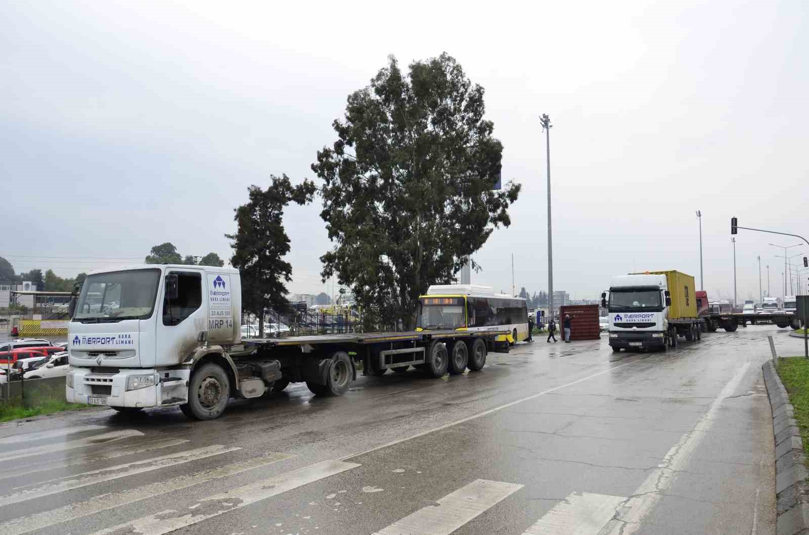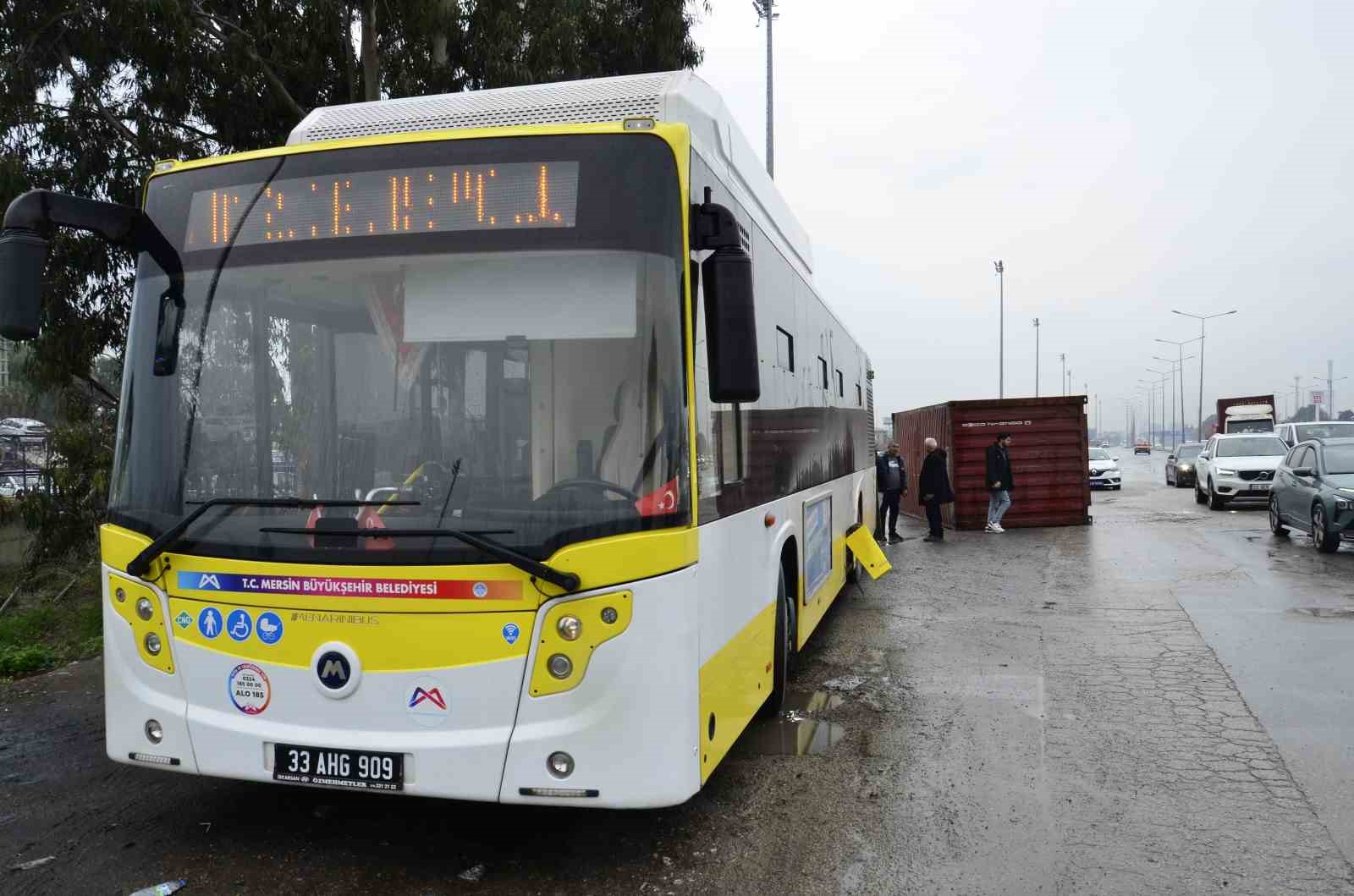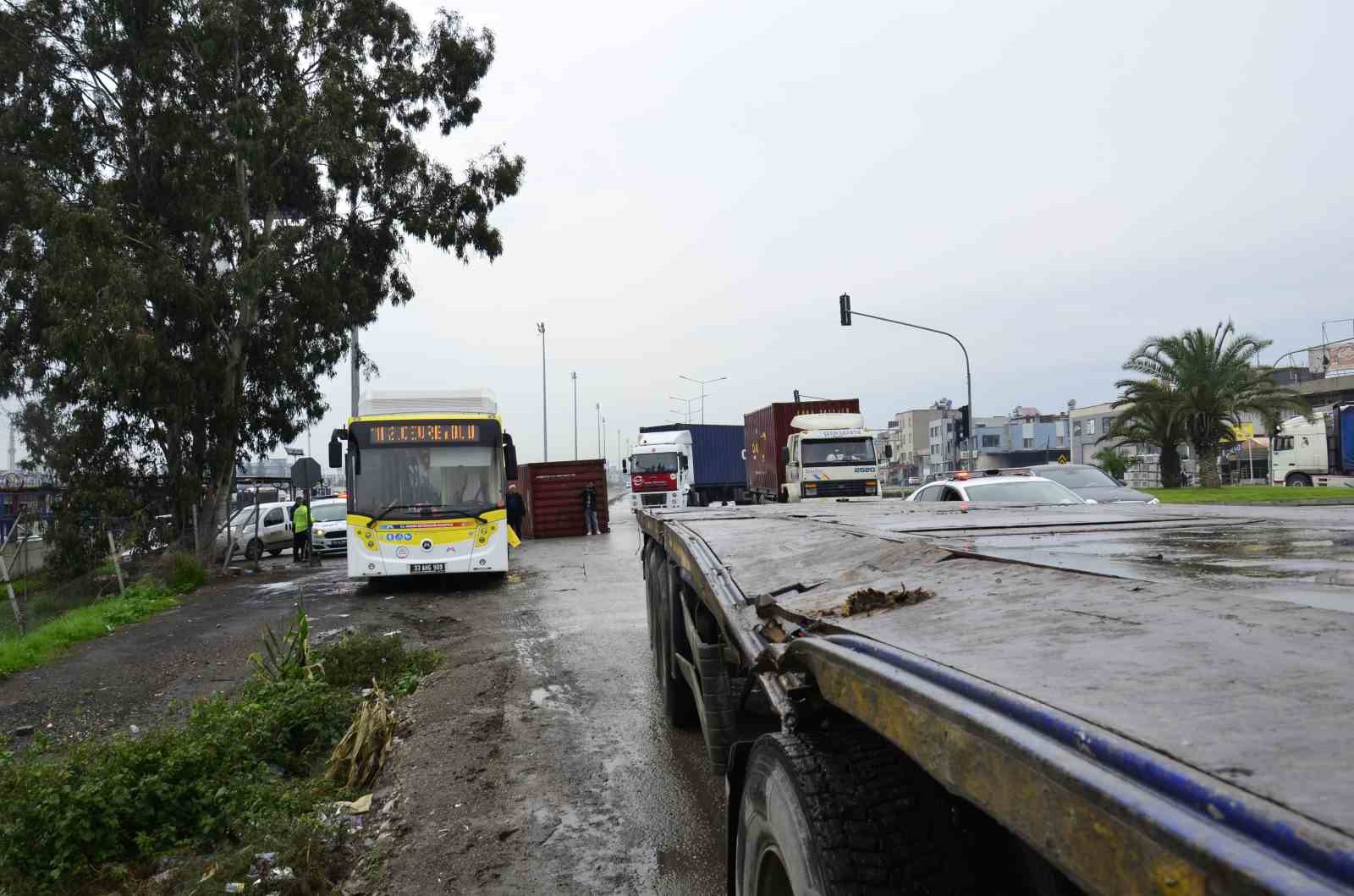 Mersin’de kavşaktan dönen tırın üzerinden düşen konteyner belediye otobüsüne çarptı.