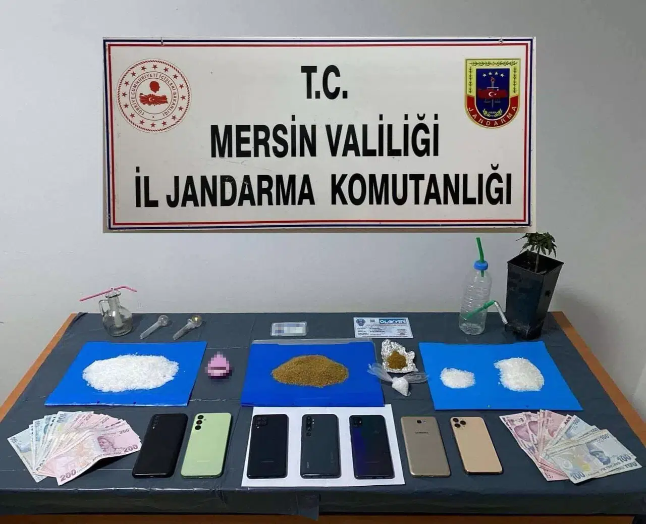 Alınan bilgiye göre, İl Jandarma Komutanlığı ekipleri uyuşturucu madde ticareti yapan şahıslara yönelik çalışma gerçekleştirdi. Ekiplerin çalışmasında Mezitli ve Erdemli ilçelerinde 8 şüphelinin uyuşturucu madde ticareti yaptığı belirlendi. Bunun üzerine belirlenen adreslere eş zamanlı operasyon yapıldı. Operasyonda 8 şüpheli gözaltına alınırken, adreslerinde yapılan aramada 2 kilo 87 gram kubar esrar, 1 kilo 296 gram metamfetamin, 438 gram bonzai, 10 gr kokain, 122 adet uyuşturucu hap, 1 adet tabanca, 6 adet uyuşturucu kullanma aparatı, 2 adet hassas terazi, 9 bin 400 TL , 105 dolar ile 100 bin İran Riyali ele geçirildi.