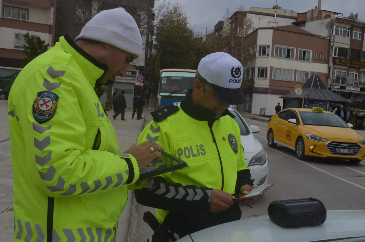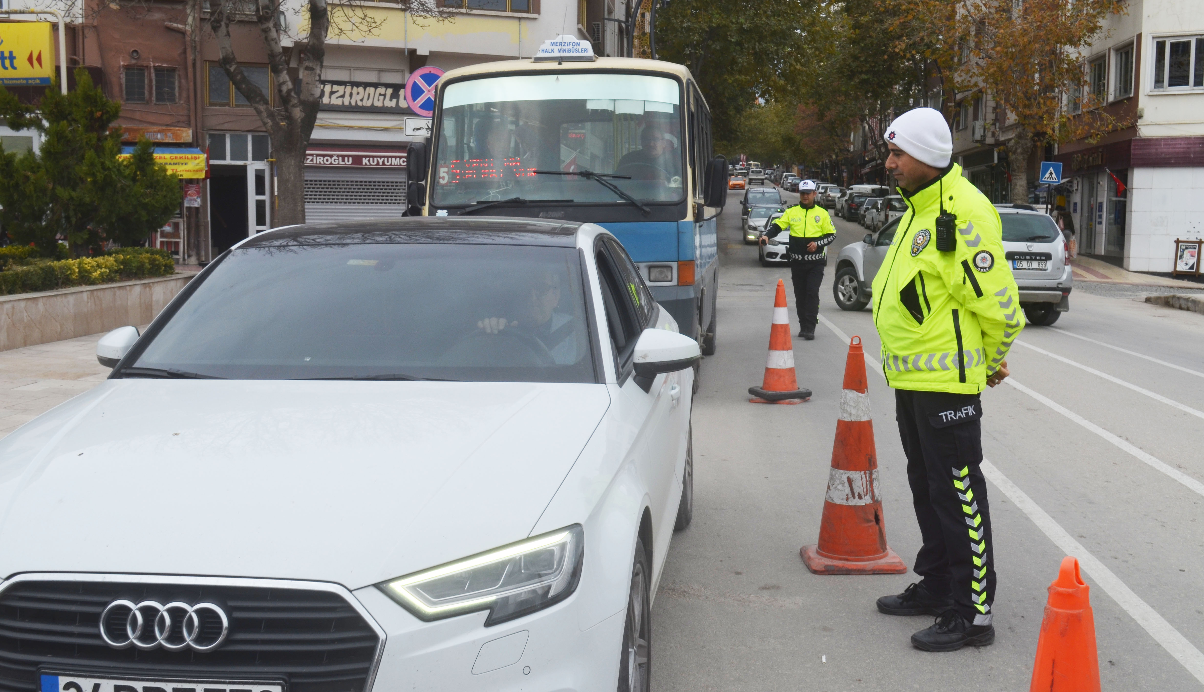 Merzifon İlçe Emniyet Müdürlüğü Trafik Büro Amirliği ekipleri, trafik yoğunluğunun bulunduğu ilçe merkezindeki ana arterlerde emniyet kemeri, sürücü belgesi, cep telefonu ve plaka kontrolü yaptı.