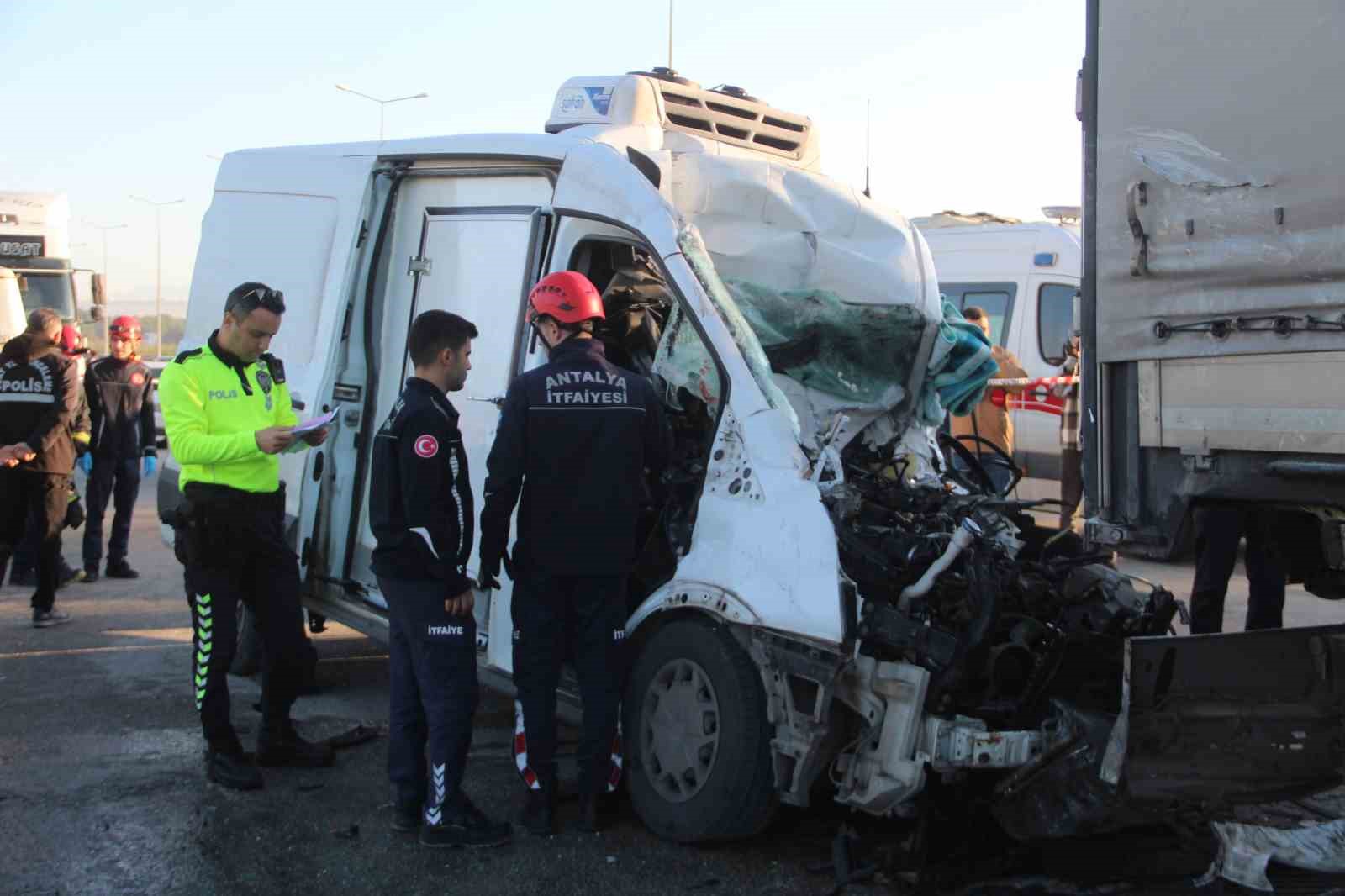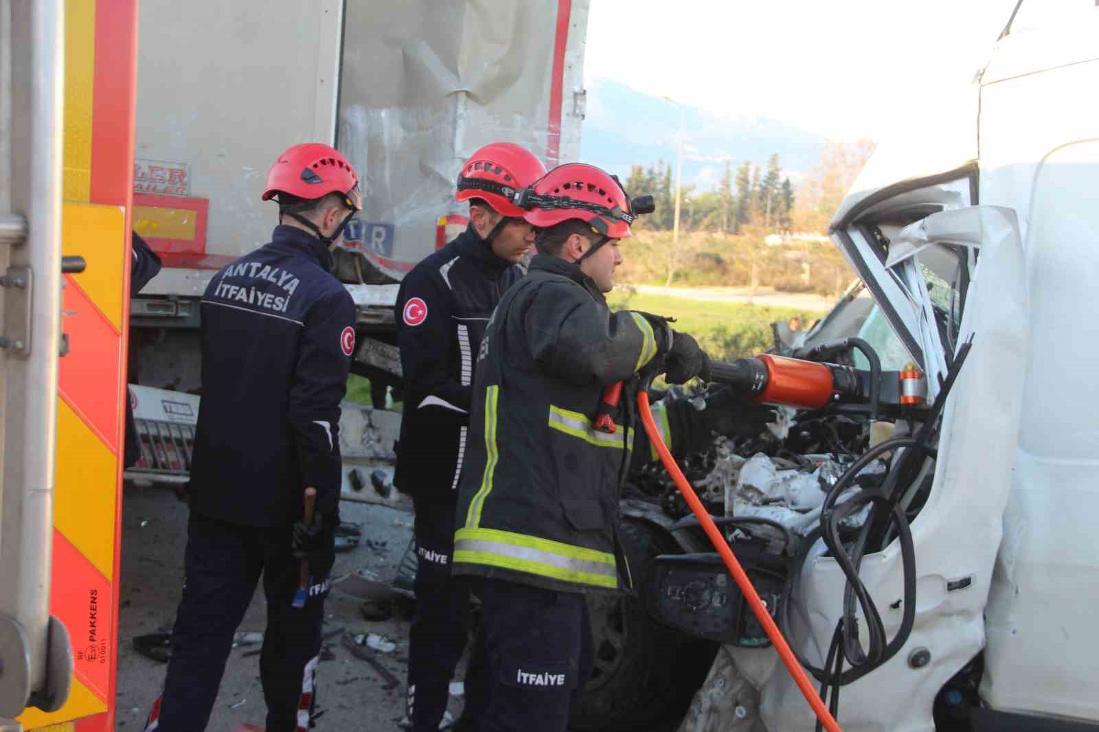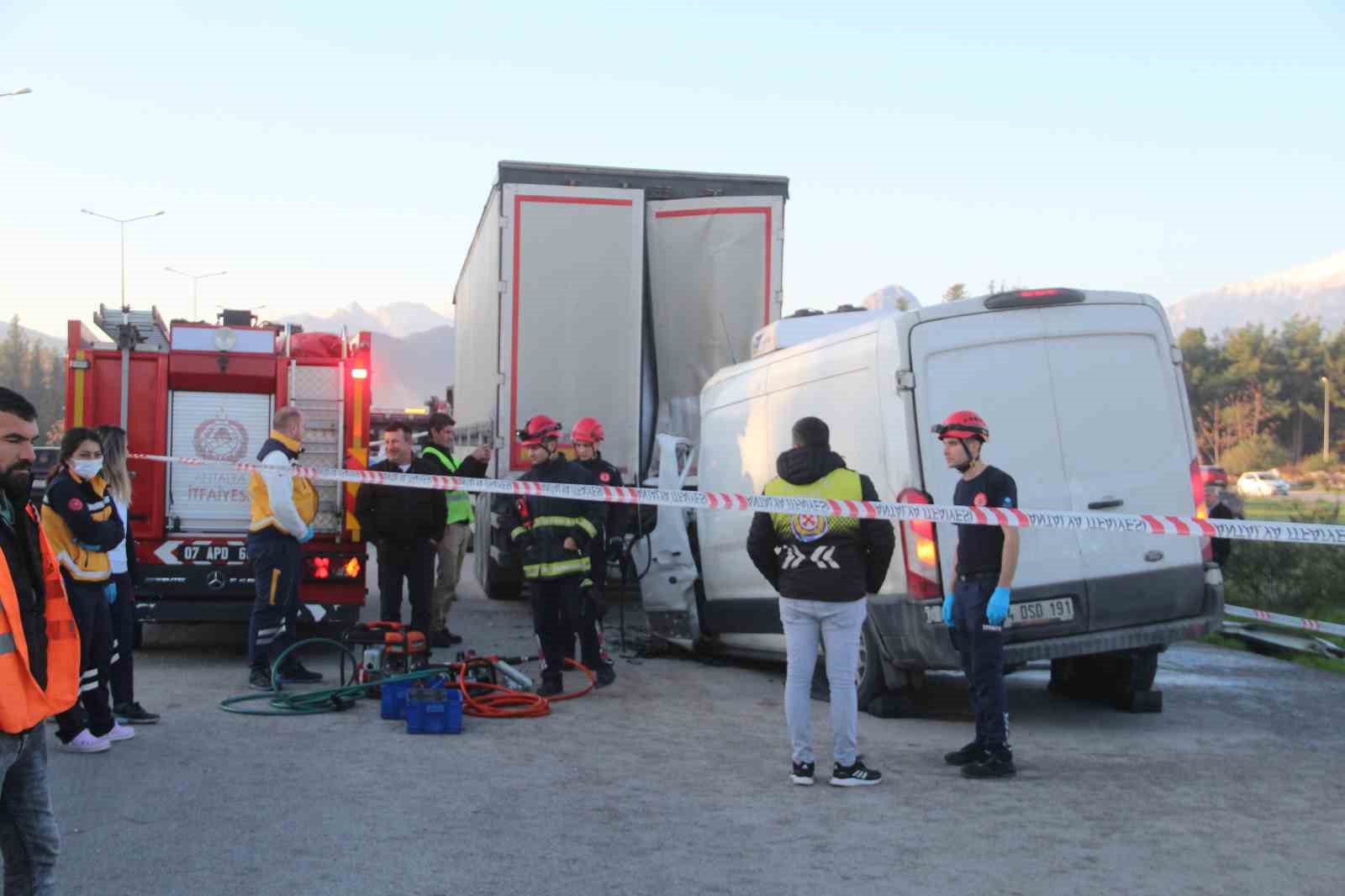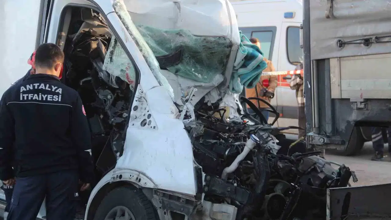 Kaza, sabah saat 08.10 sırasında Konyaaltı ilçesi Molla Yusuf Mahallesi Batı Çevre Yolu’nda meydana geldi. 34 DSD 191 plakalı minibüsle limana doğru seyir halindeki Mehmet Burak Açikgöz (21), henüz belirlenemeyen bir nedenle direksiyon hakimiyetini kaybetti. Kontrolden çıkan minibüs, yolun sağındaki park alanında park halinde bulunan 03 PTS 130 plakalı tırın dorsesine çarptı. Kazayı görenler durumu 112 Acil Çağrı Merkezine bildirdi. İhbarla adrese sağlık, polis ve itfaiye ekipleri sevk edildi. Antalya Büyükşehir Belediyesi İtfaiye ekipleri ilk önce yolcu bölümünde sıkışan Arif Kamlı’yı (22) yaralı olarak araçtan çıkardı. Ambulansa alınan Kamlı, Akdeniz Üniversitesi Hastanesi’ne kaldırıldı. Çarpmanın şiddetiyle hurdaya dönen minibüsün ön bölümünde sıkışan sürücü Açikgöz’ün yapılan kontrolde hayatını kaybettiği belirlendi. Açikgöz’ün cenazesi, minibüsün parçalarının kesilmesiyle yaklaşık yarım saatlik çalışmayla çıkarıldı. Cenaze aracına alınan Açikgöz’ün cenazesi otopsi için Antalya Adli Tıp Kurumu morguna kaldırıldı. Kazayla ilgili inceleme devam ediyor.