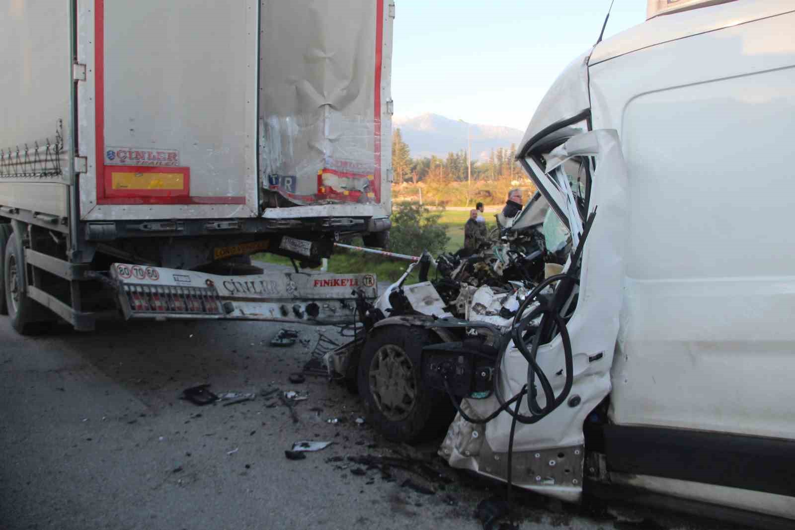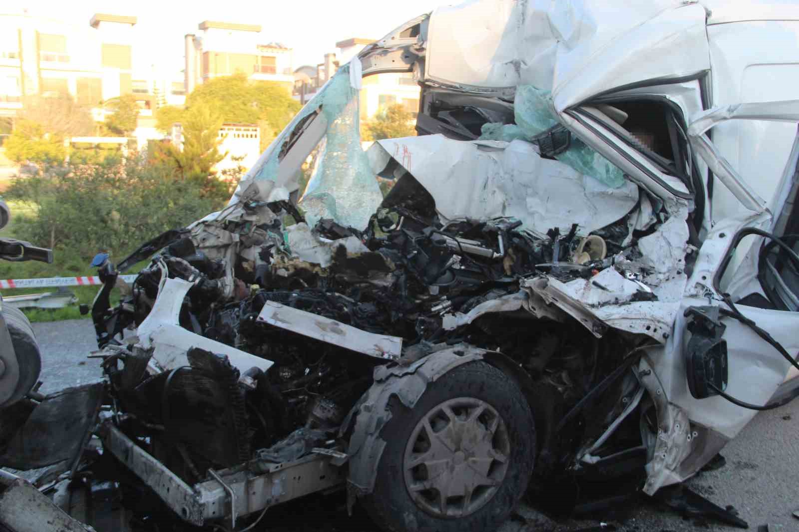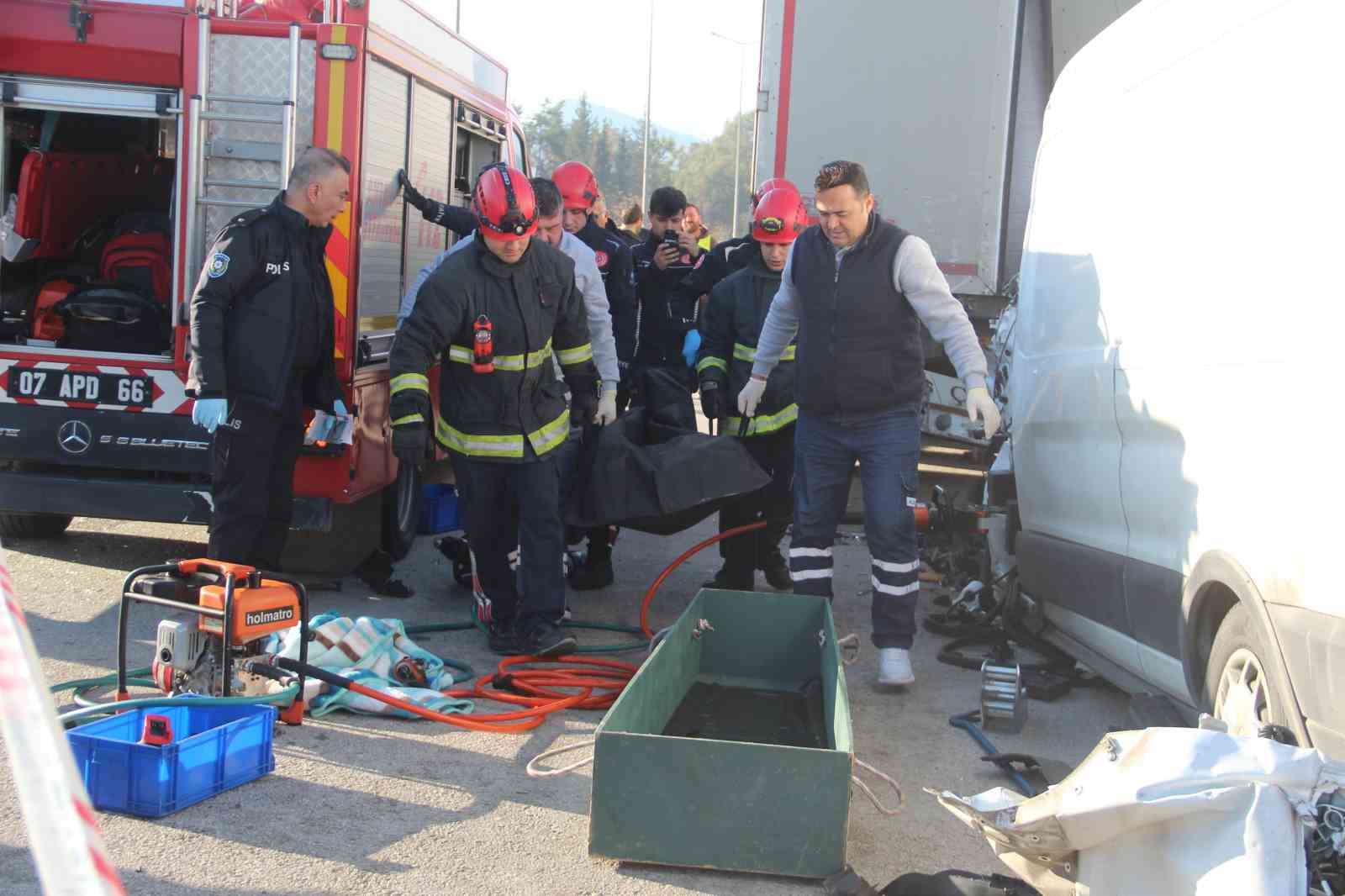 Kaza, sabah saat 08.10 sırasında Konyaaltı ilçesi Molla Yusuf Mahallesi Batı Çevre Yolu’nda meydana geldi. 34 DSD 191 plakalı minibüsle limana doğru seyir halindeki Mehmet Burak Açikgöz (21), henüz belirlenemeyen bir nedenle direksiyon hakimiyetini kaybetti. Kontrolden çıkan minibüs, yolun sağındaki park alanında park halinde bulunan 03 PTS 130 plakalı tırın dorsesine çarptı. Kazayı görenler durumu 112 Acil Çağrı Merkezine bildirdi. İhbarla adrese sağlık, polis ve itfaiye ekipleri sevk edildi. Antalya Büyükşehir Belediyesi İtfaiye ekipleri ilk önce yolcu bölümünde sıkışan Arif Kamlı’yı (22) yaralı olarak araçtan çıkardı. Ambulansa alınan Kamlı, Akdeniz Üniversitesi Hastanesi’ne kaldırıldı. Çarpmanın şiddetiyle hurdaya dönen minibüsün ön bölümünde sıkışan sürücü Açikgöz’ün yapılan kontrolde hayatını kaybettiği belirlendi. Açikgöz’ün cenazesi, minibüsün parçalarının kesilmesiyle yaklaşık yarım saatlik çalışmayla çıkarıldı. Cenaze aracına alınan Açikgöz’ün cenazesi otopsi için Antalya Adli Tıp Kurumu morguna kaldırıldı. Kazayla ilgili inceleme devam ediyor.