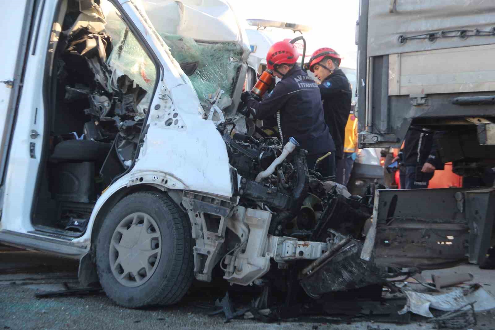 Antalya’da park halindeki tıra arkadan çarpan minibüsteki sürücü hayatını kaybetti, yolcu olan bir kişi ağır yaralandı. Motor bölümü hurdaya dönen araçta sıkışan sürücü yaklaşık yarım saatlik çalışmayla çıkarılırken, kaza anında tır içinde uyuyan sürücü, "Rüyadayım zannettim" dedi.