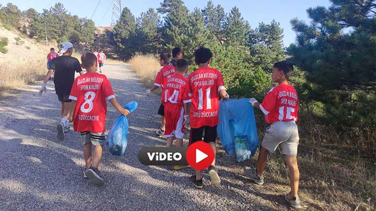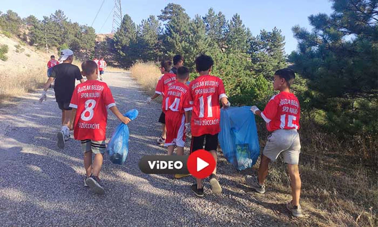 Çorum'un Oğuzlar ilçesinde minik futbolcular antrenman ve koşu yaptıkları yol kenarındaki çöpleri topladı.