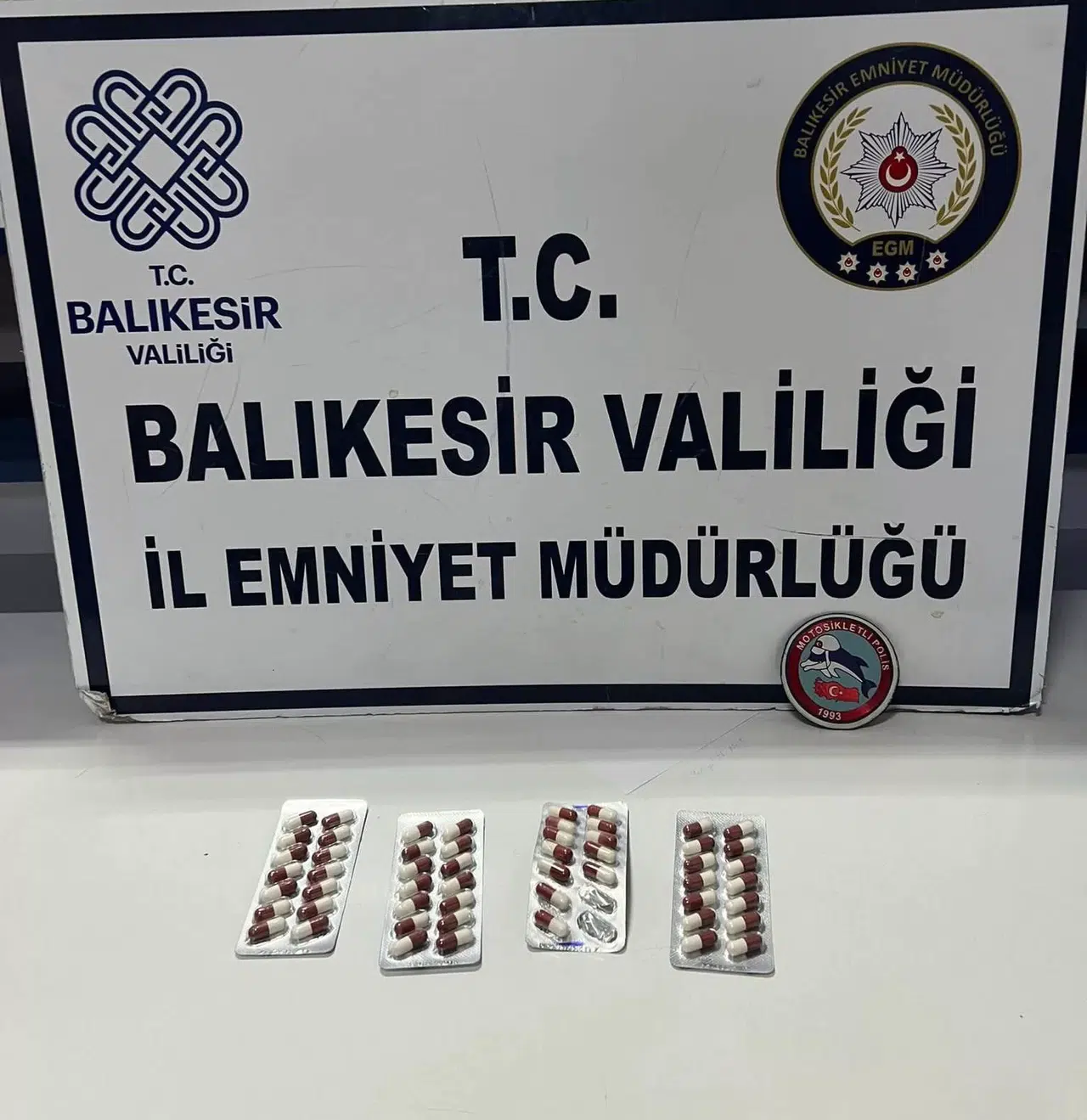 Balıkesir İl Emniyet Müdürlüğü Asayiş Şube Müdürlüğüne bağlı Motosikletli Polis Timlerince, il merkezinde bulunan Atatürk Mahallesi Uruzbey Caddesi üzerinde şüpheli şahıslar ve araçlar üzerinde yapılan uygulama esnasında; R.G. isimli kişi şüphe üzerine durdurularak yapılan kaba üst yoklamasında şahsın mont cebinde 4 şarjör halinde toplam 54 adet sentetik ecza maddesi ele geçirildi. R.G. hakkında gerekli işlemlere başlandığı öğrenildi.