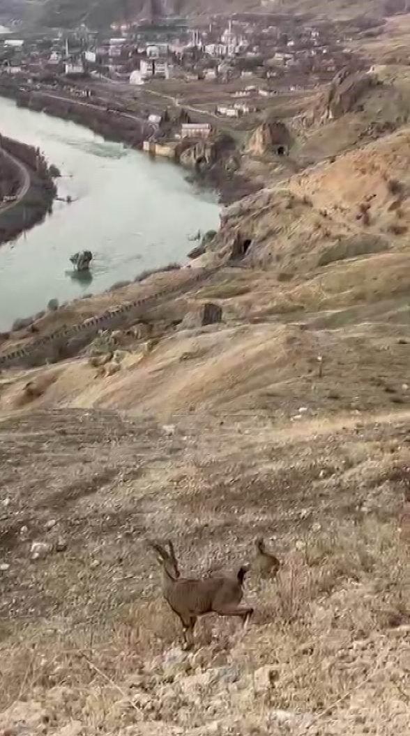 Elazığ’ın tarihi Palu ilçesinde eşsiz manzarayı çeken bir vatandaş, koruma altında bulunan dağ keçilerini görüntüledi.