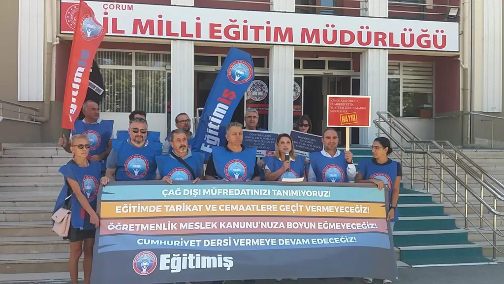 Çağdışı müfredatınızı tanımıyoruz, eğitimde tarikat ve cemaatlere geçit vermeyeceğiz, öğretmenlik meslek kanununa boyun eğmeyeceğiz, cumhuriyet dersi vermeye devam edeceğiz.”