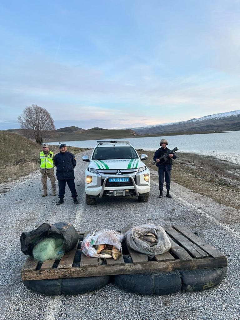 Valilikten yapılan açıklamaya göre, Muş Jandarma Komutanlığı Asayiş Şube Müdürlüğüne bağlı Çevre Doğa ve Hayvanları Koruma Timi, kontrol ve denetimlerini aralıksız sürdürüyor. Bu çerçevede 18 Ocak’ta Varto ilçesi Kayalıdere köyü mevkisindeki Alparslan 2 Barajı’nda ekipler, ticari amaçla germe ve uzatma ağ ile balık tutan F.E. ve kardeşi E.E.’yi suçüstü yakaladı. 85 metre uzunluğunda germe balık ağı, ilkel yapılan lastik bot ve 76 kilogram ağırlığında avlanılmış balık ele geçirildi. Avlanma yapan 2 kişiye 17 bin 836 lira idari para cezası uygulandı. El konulan ürünler Varto İlçe Tarım ve Orman Müdürlüğü’ne teslim edildi.
