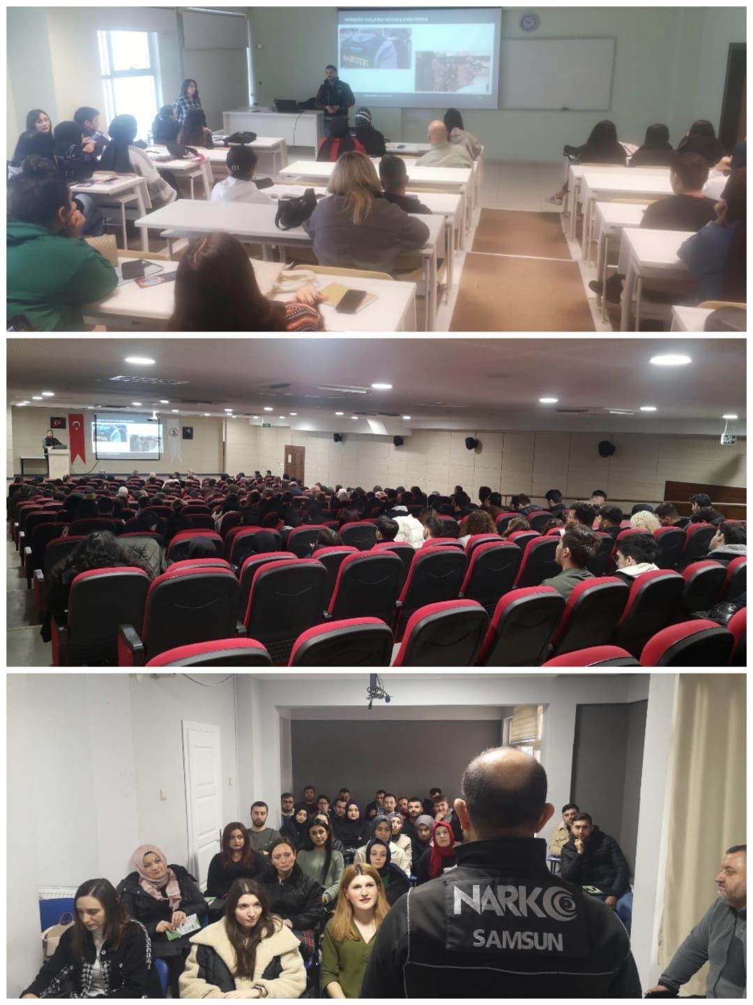Samsun İl Emniyet Müdürlüğü görevlilerince, uyuşturucu madde bağımlılığıyla mücadele alanında gençlere yönelik farkındalık oluşturmak, gençleri kendi şahsi çıkarları ve menfaatleri için uyuşturucu bataklığına sürüklemek isteyen zararlı şahıslardan korumak ve uzaklaştırmak için Samsun genelinde eğitim ve bilinçlendirme faaliyetlerine hız kesmeden devam ediyor. Bu kapsamda Narkorehber polisleri tarafından Ondokuz Mayıs Üniversitesi İnsan ve Toplum Bilimleri Fakültesi’nde 350 öğrenciye, Samsun Üniversitesi coğrafya bölümünden 120 öğrenciye, bir özel güvenlik firmasında eğitim gören kursiyerlerinden 80 kişiye olmak üzere 3 etkinlikte toplam 550 kişiye bilgilendirme yaptı.