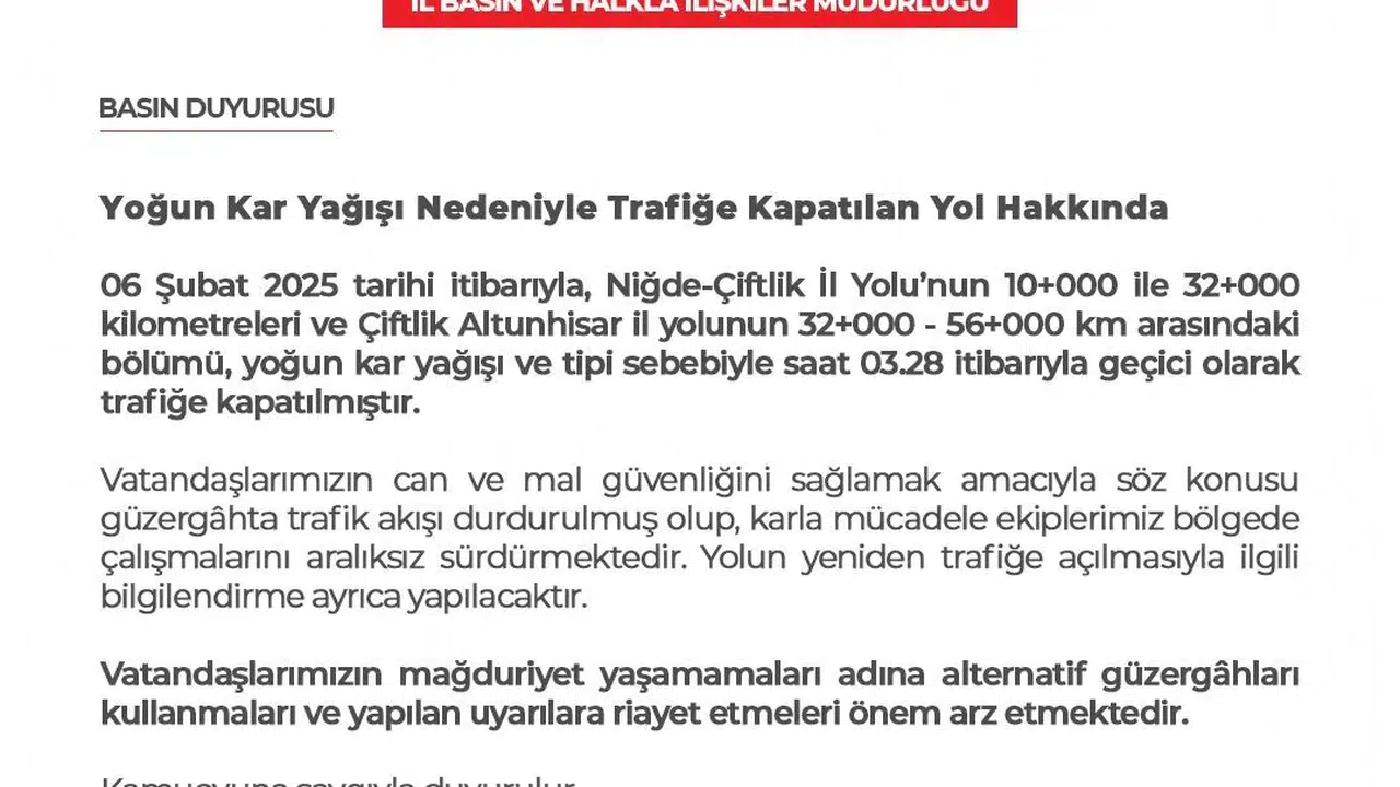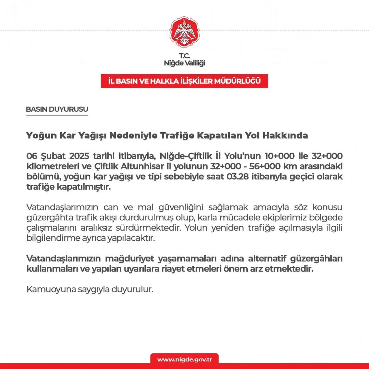 Niğde Valiliği tarafından yapılan açıklamada, Niğde-Çiftlik yolunun 10. ve 32. kilometreleri, Çiftlik-Altunhisar yolunun ise 32. ve 56. kilometreleri arasındaki bölümün yoğun kar yağışı ve tipi sebebiyle saat 03.28’de geçici olarak trafiğe kapatıldığı duyuruldu. Açıklamada, "Vatandaşların can ve mal güvenliğini sağlamak amacıyla söz konusu güzergâhta trafik akışı durdurulmuş olup, karla mücadele ekiplerimiz bölgede çalışmalarını aralıksız sürdürmektedir. Yolun yeniden trafiğe açılmasıyla ilgili bilgilendirme ayrıca yapılacaktır. Vatandaşlarımızın mağduriyet yaşamamaları adına alternatif güzergâhları kullanmaları ve yapılan uyarılara riayet etmeleri önem arz etmektedir" ifadelerine yer verildi.