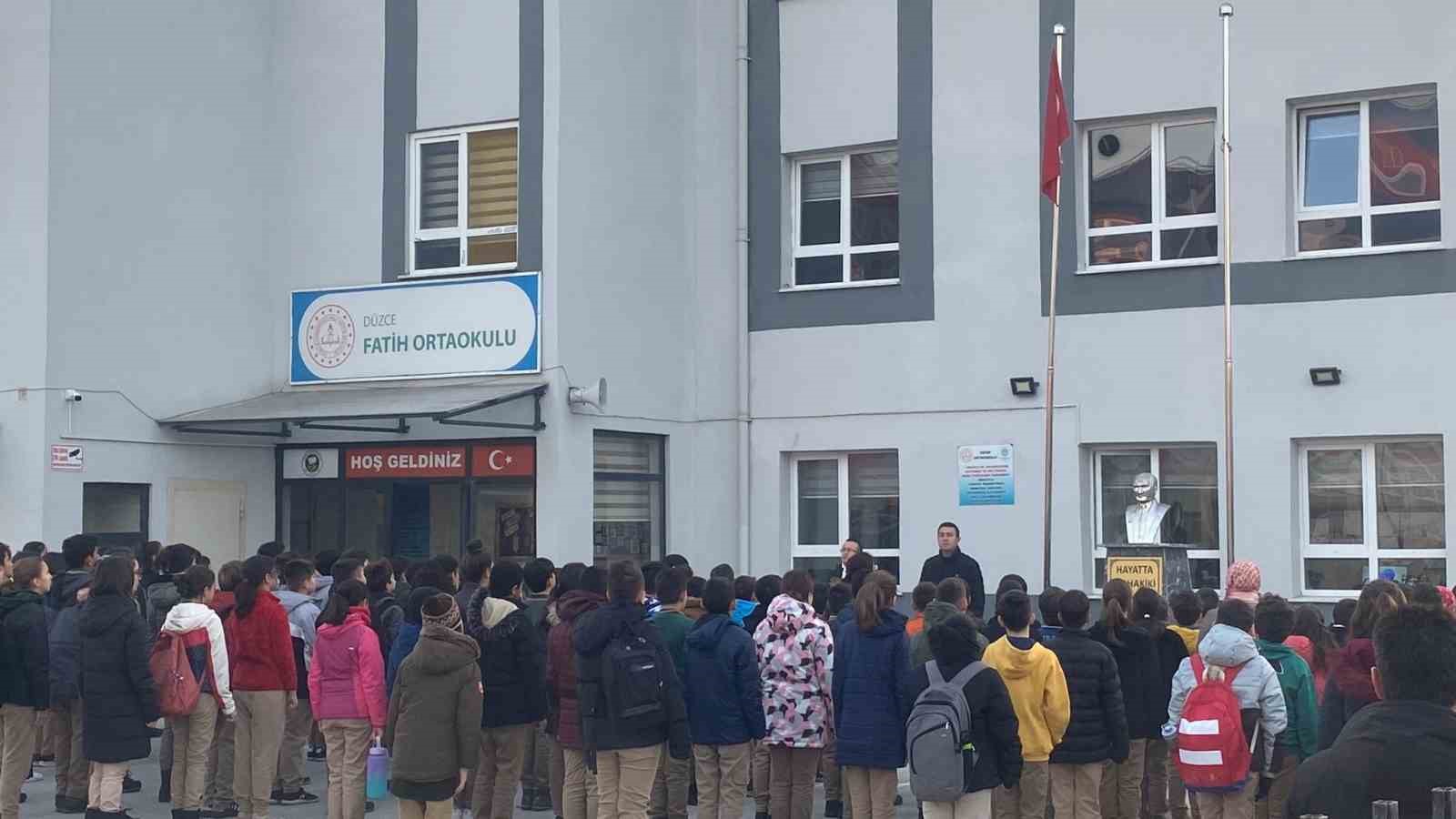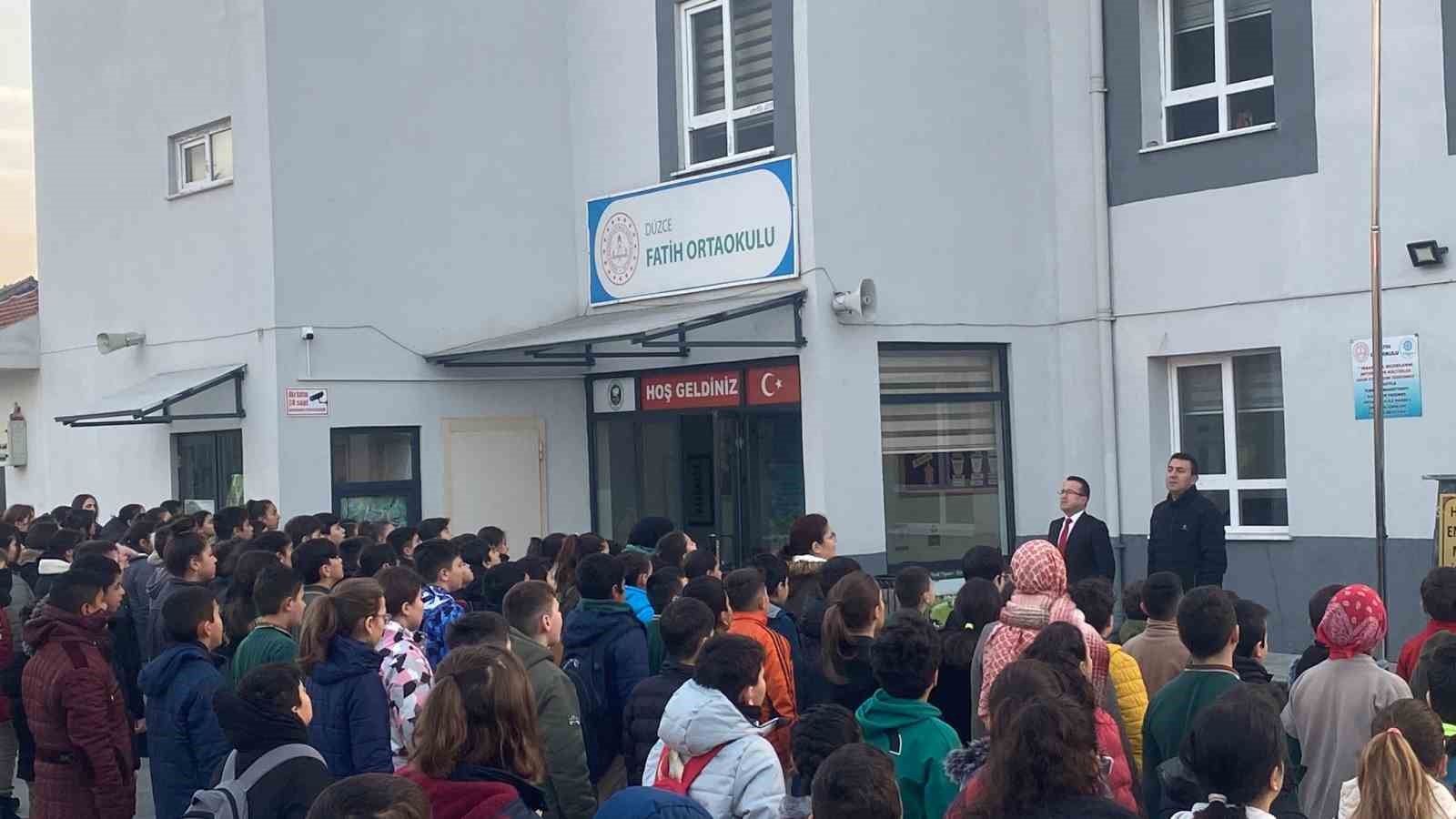 Milli Eğitim Bakanı Yusuf Tekin’in talimatıyla yurt genelinde olduğu gibi Düzce’de de bayrak töreni öncesinde şehitler için bir dakikalık saygı duruşunda bulunuldu. Pençe Kilit bölgesinde teröristlerce düzenlenen taciz ve sızma girişimi neticesinde şehit olan 9 askerimiz başta olmak üzere tüm şahitlerimiz için bir dakikalık saygı duruşu yapıldı. Saygı duruşunun ardından İstiklal Marşımızı okuyan öğrenciler sınıflarının yolunu tuttu.