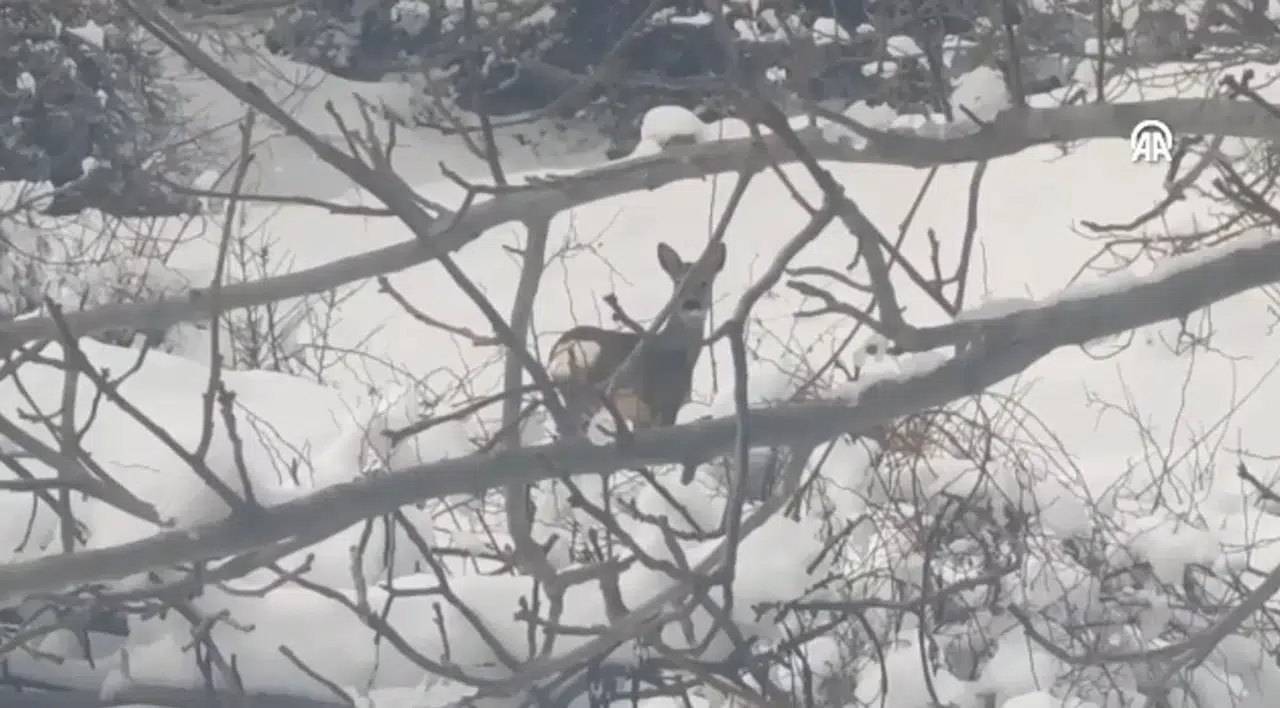 Beyaz örtüyle kaplanan bölgede yabani hayvanlar yiyecek bulmak için ormanlık alana yayıldı.