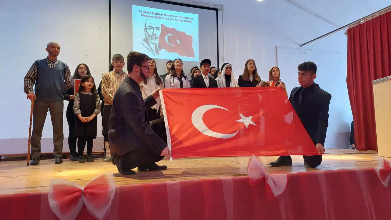 Saygı duruşunda bulunulması ve İstiklal Marşı’nın okunmasıyla başlayan programda günün anlam ve önemini belirten konuşmayı okulun Tarih Öğretmeni Fatih Hastaoğlu yaptı. Mehmet Akif Ersoy’un fikirlerini anlatan Hastaoğlu, “İnandığı gibi yaşamış, çilesini çekmediği hiçbir düşünceye eserlerinde yer vermemiştir. Yaşayışıyla duruşuyla istiklal şairi sıfatını ziyadesiyle hak etmiş bir anıt insandır” dedi.