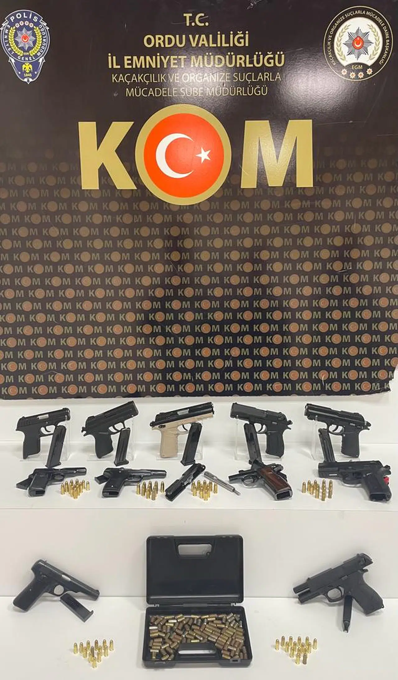 Ö.S'nin Altınordu ilçesindeki ev ve iş yerinde yapılan aramada, kargo paketlerinin içerisine saklanmış 10 ruhsatsız tabanca ile bu tabancalara ait mermi ele geçirildi.