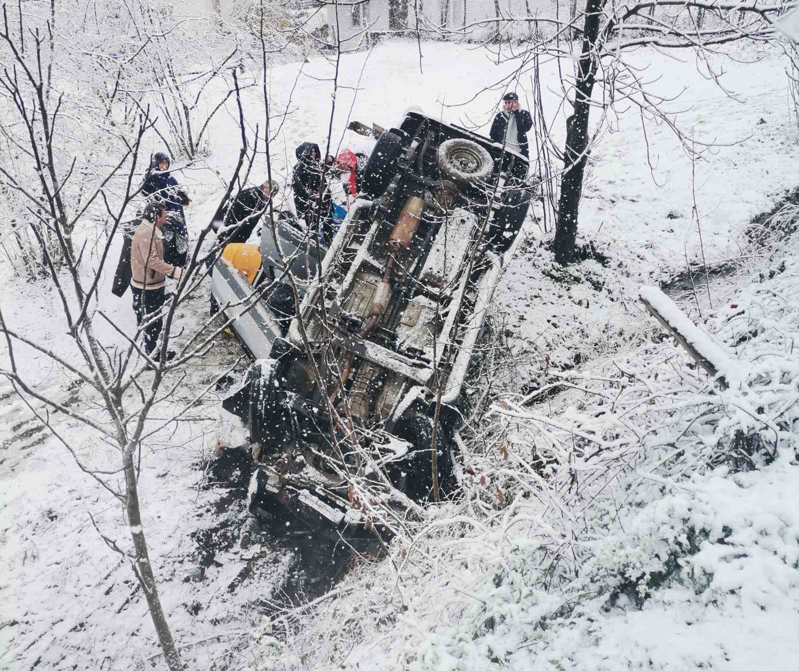Ordu’nun Ünye ilçesinde etkili olan kar yağışından dolayı kontrolden çıkan kamyonet fındık bahçesine yuvarlanırken, kazada sürücü ve yanında bulunan eşi yaralandı.