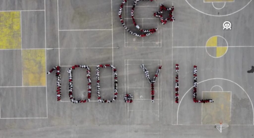 Okul bahçesindeki etkinlikte, okulun tüm öğrencilerinin katılımıyla ay yıldız ve 100. yıl koreografisi oluşturuldu. Koreografiye katılan öğrenciler, Türk bayrağı ile Atatürk posteri açarak gösteriyi tamamladı.