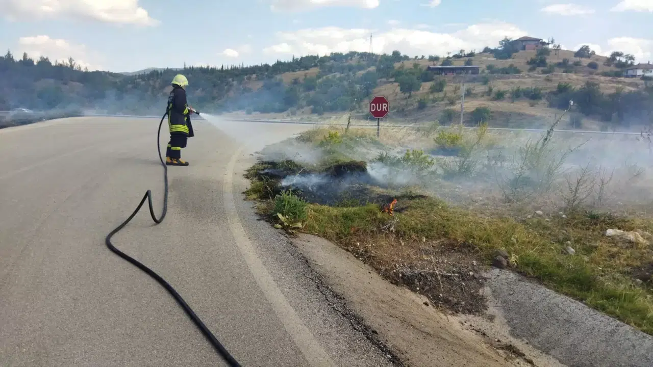 Çorum'un Osmancık ilçesi D-100 karayolu kenarında çıkan örtü yangını çamlık alana sıçramadan söndürüldü.
