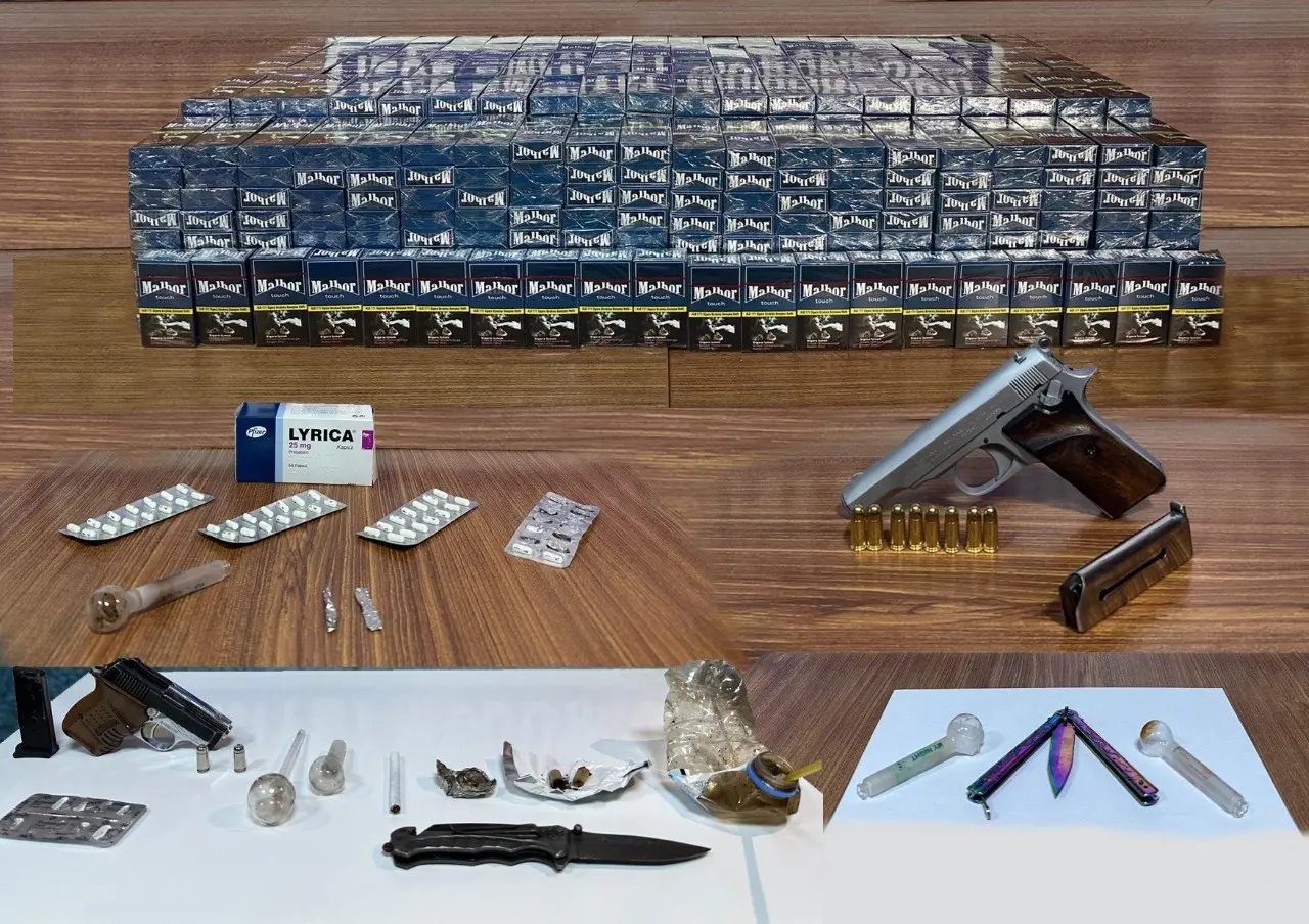 Operasyonlarda metamfetamin, sentetik ecza hapı, uyuşturucu kullanma apartı, bin paket doldurulmuş makaron, 3 adet ruhsatsız yabanca, 2 adet bıçak ele geçirildi.