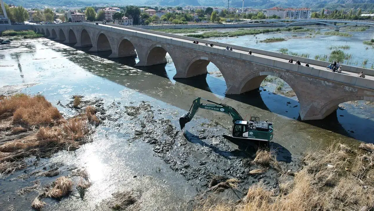 Devlet Su İşleri (DSİ) 5. Bölge Müdürlüğü ekipleri nehirdeki sazlık alanlar ve nehir dibindeki balçığı temizliyor.