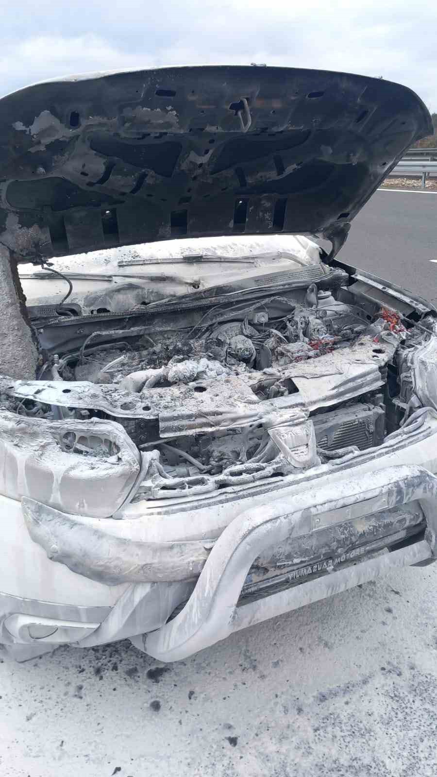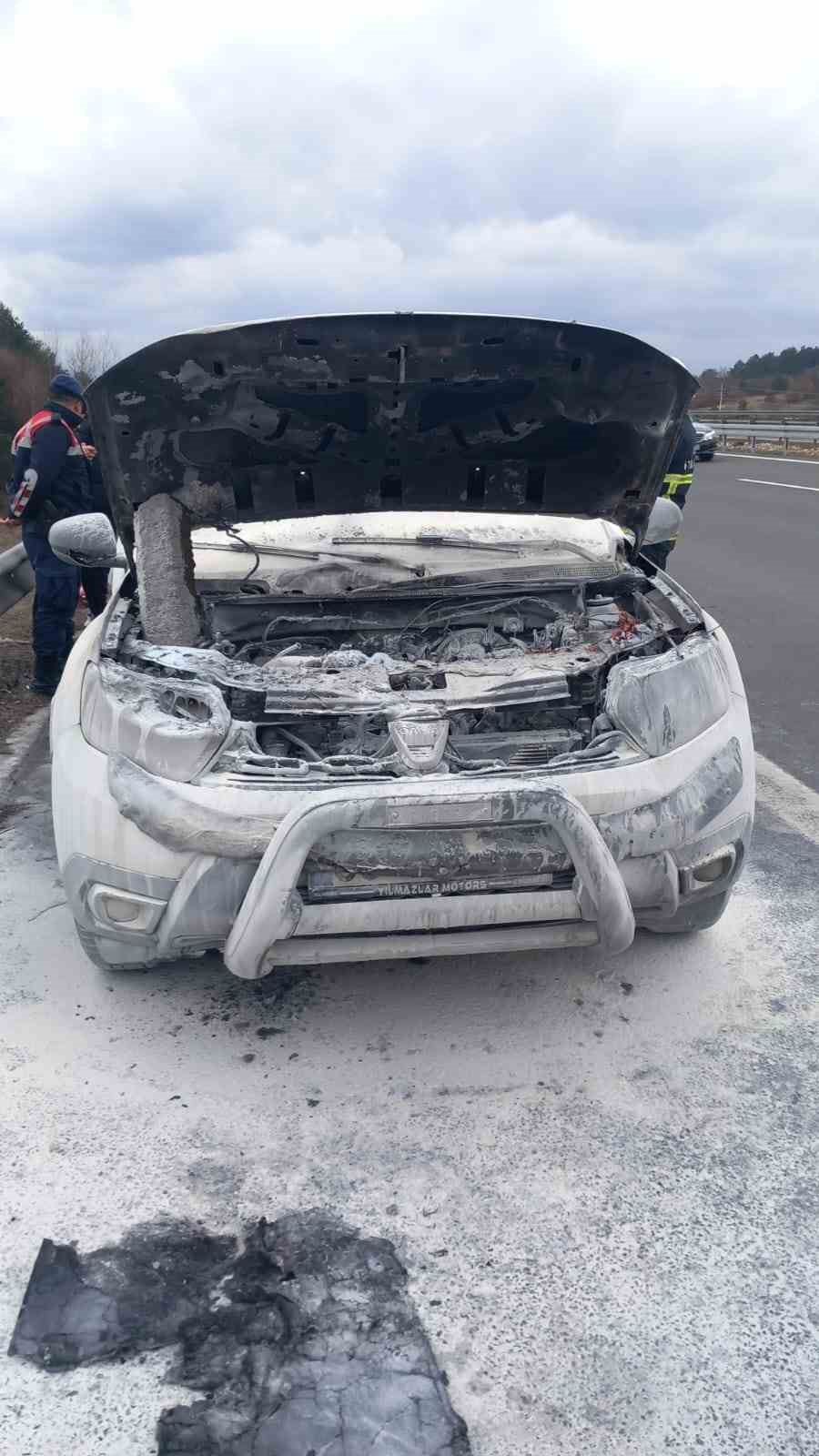 Anadolu Otoyolu’nun Bolu geçişinde seyir halindeki Dacia marka cip motor kısmı alev alev yandı. Araçta çıkan yangın itfaiye ekiplerince söndürüldü.