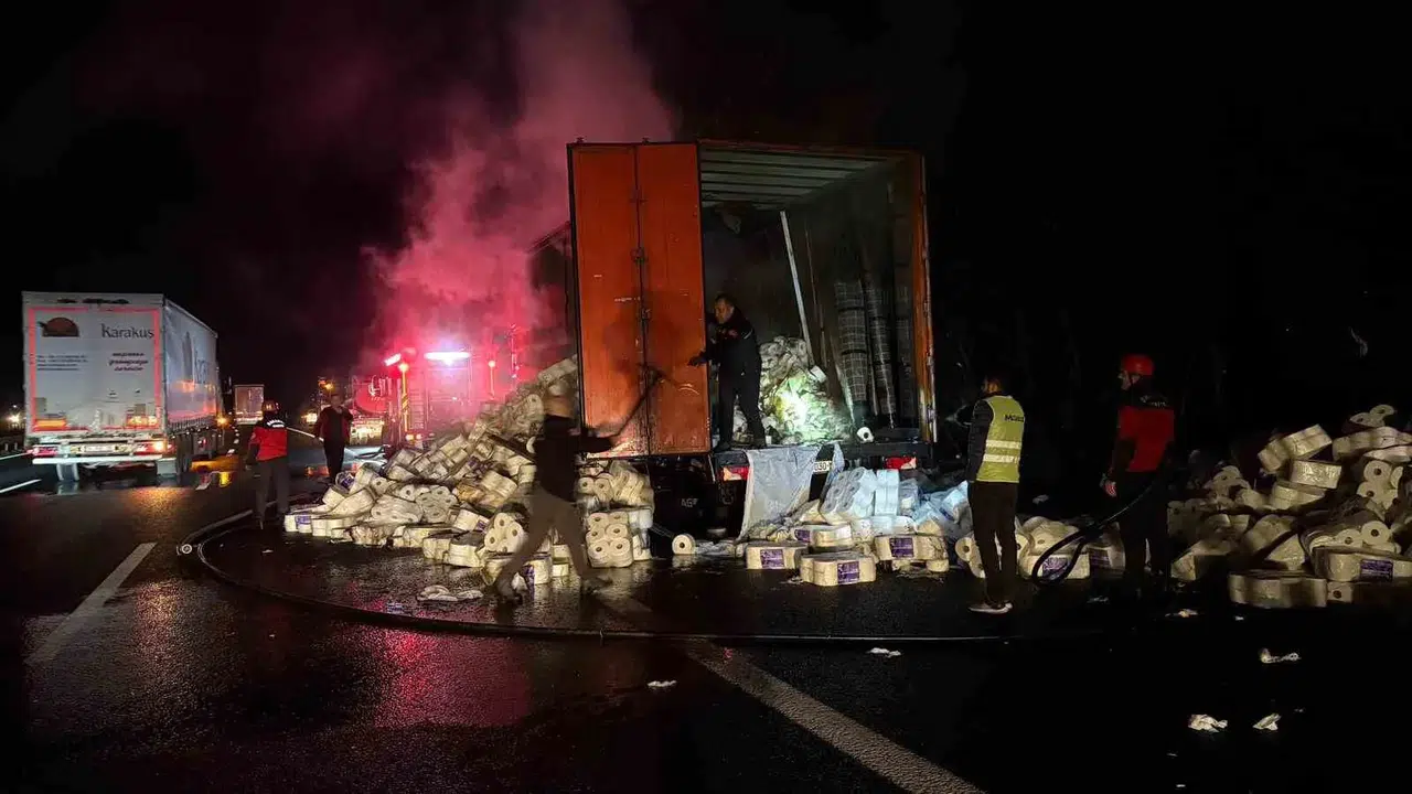 Anadolu Otoyolu Sakarya geçişinde kağıt havlu yüklü tırın dorsesi alev aldı. Dorsede bulunan malzemelerin birçoğunun kullanılamaz hale geldiği yangın, itfaiye ekiplerince söndürüldü.