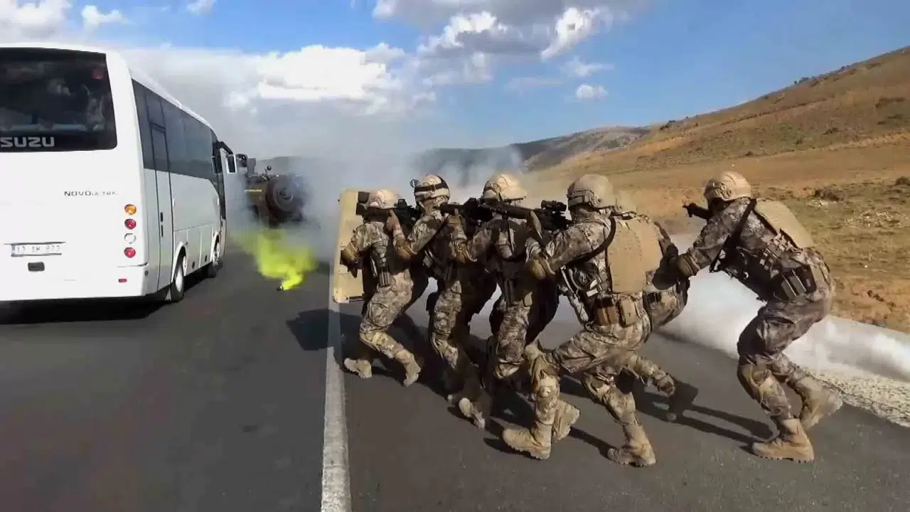 Bitlis’te Özel Harekat polislerinin gerçekleştirdiği tatbikat film sahnelerini aratmazken, sis bombalarının içerisinde rehineleri kurtaran timlerim görüntüsü izleyenleri kendine hayran bıraktı. Senaryo gereği rehin alınan yolcuların serbest bırakılması için müzakerecinin çabalarının sonuç vermemesi üzerine Özel Harekat tarafından araca operasyon düzenlendi.