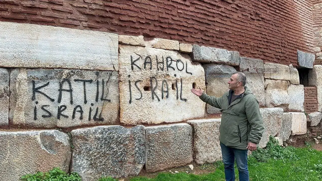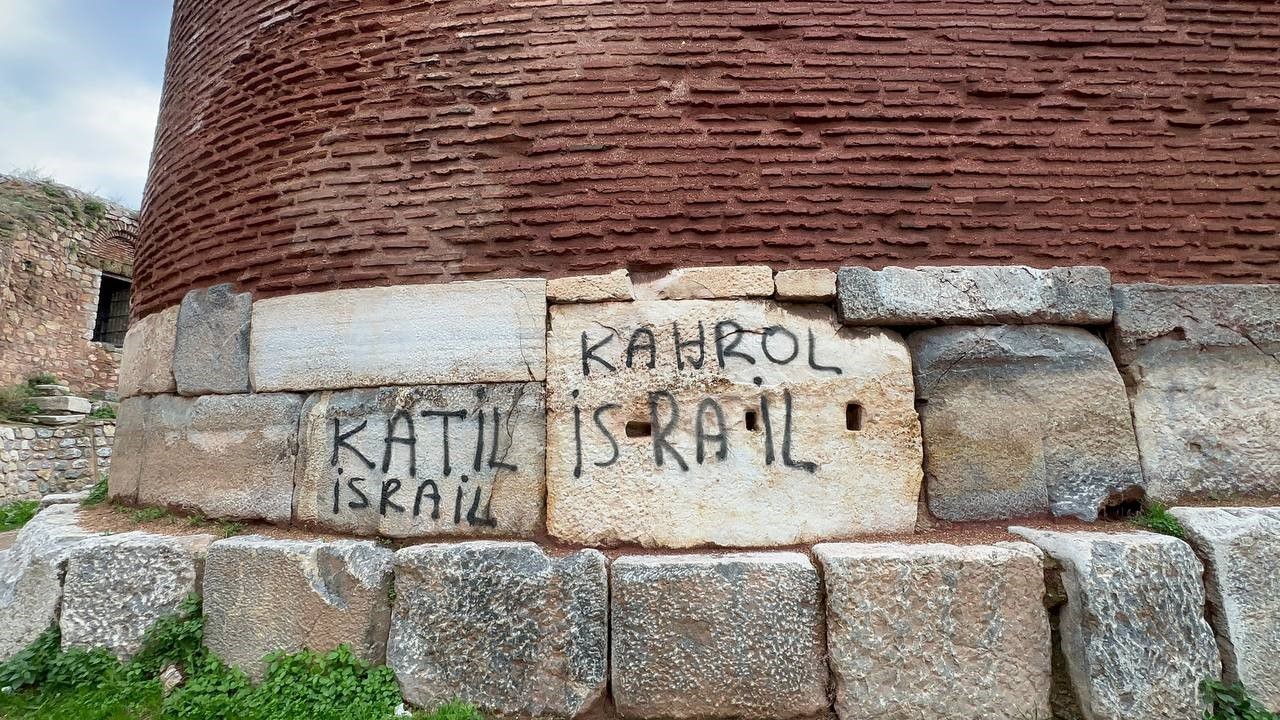 Medeniyetlere başkentlik yapmış Bursa’nın tarihi İznik ilçesinde 2 bin yıllık surlara sprey boya ile "Katil İsrail" yazdılar.