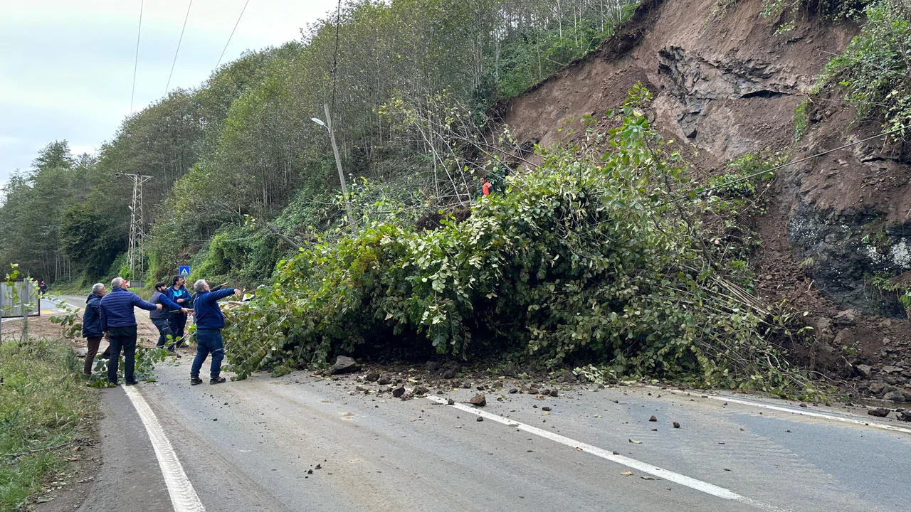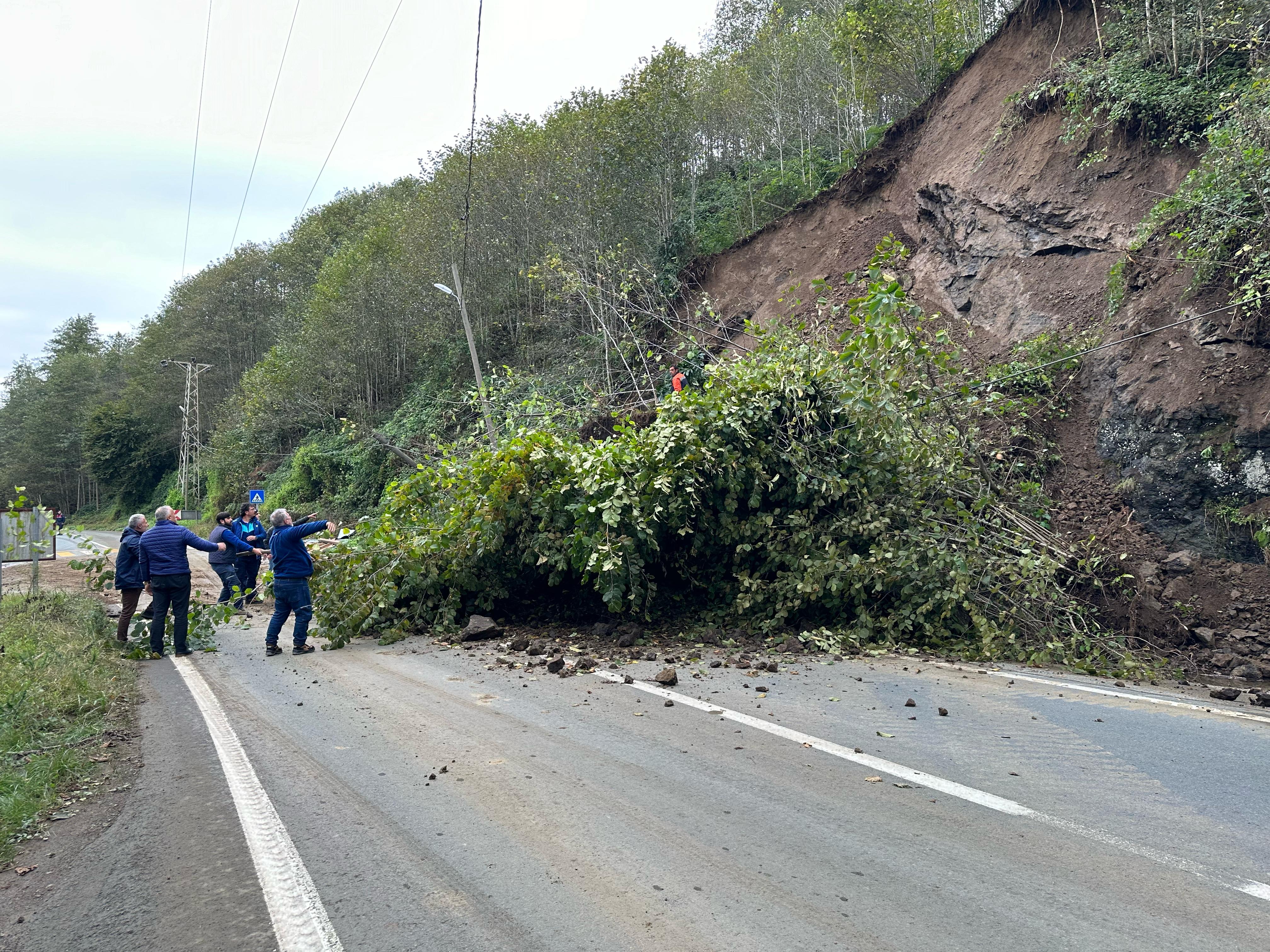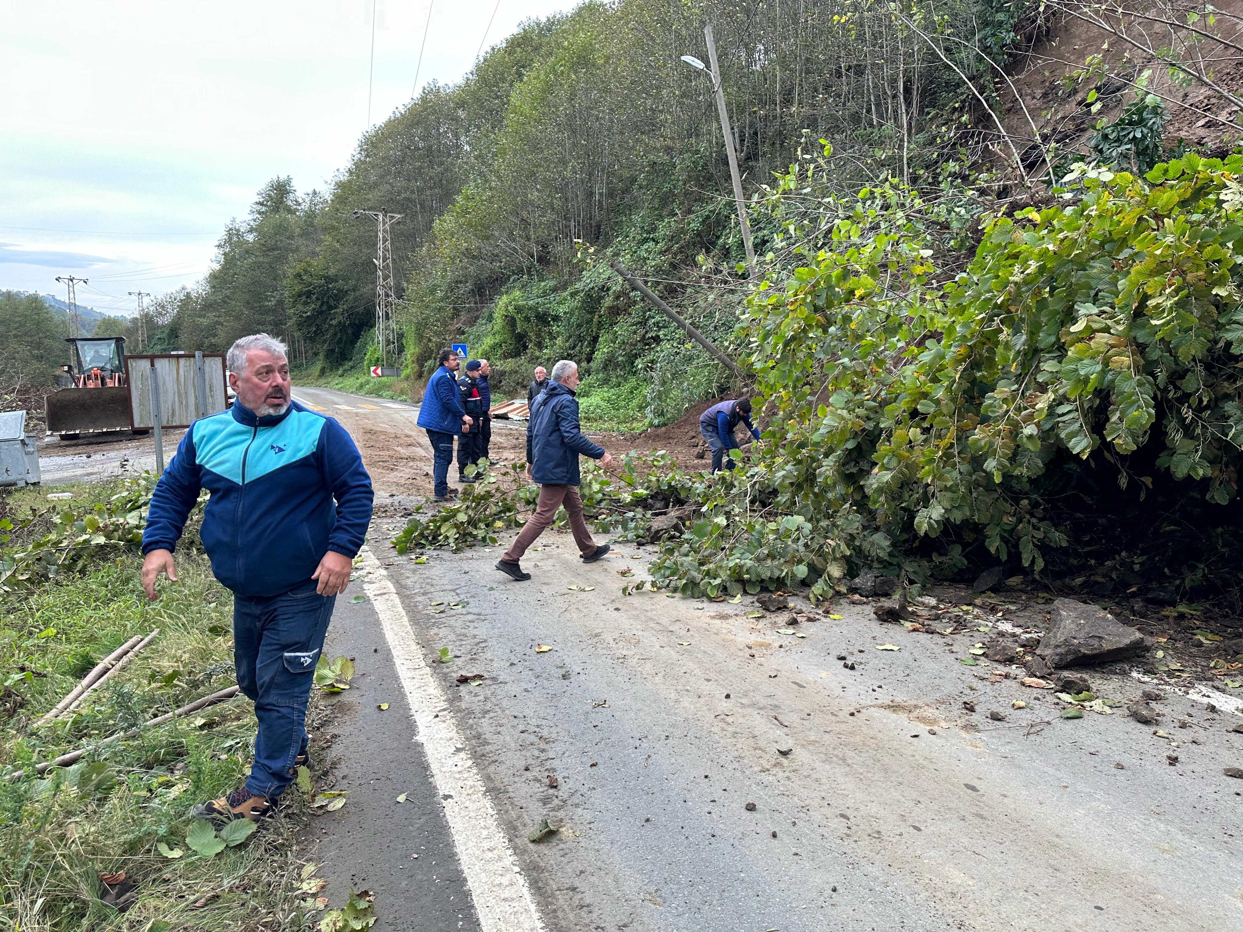 Karayolları ekipleri, iş makineleri yardımıyla yola sürüklenen toprak birikintisi ve ağaçları temizledi.